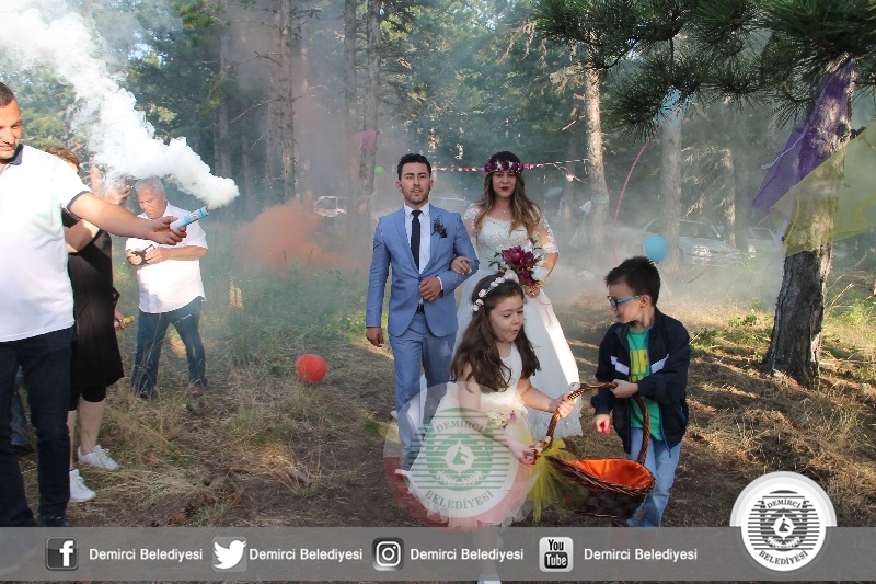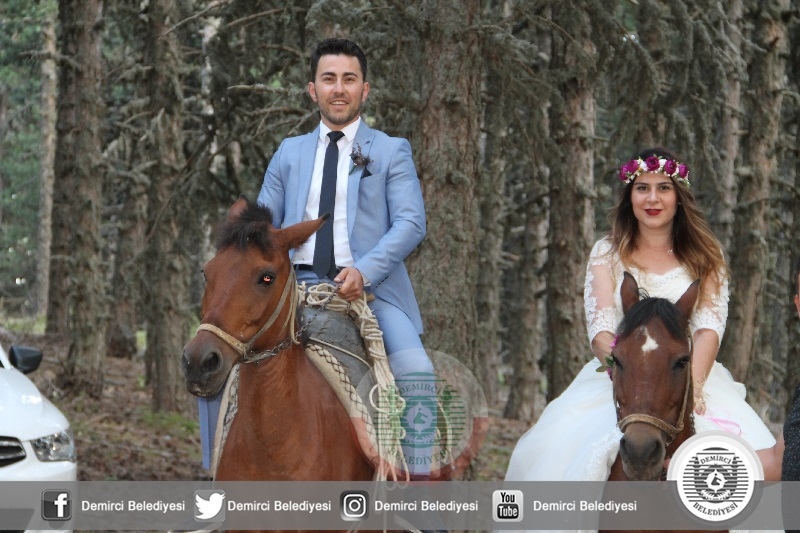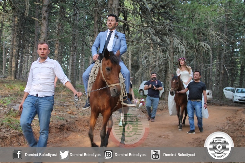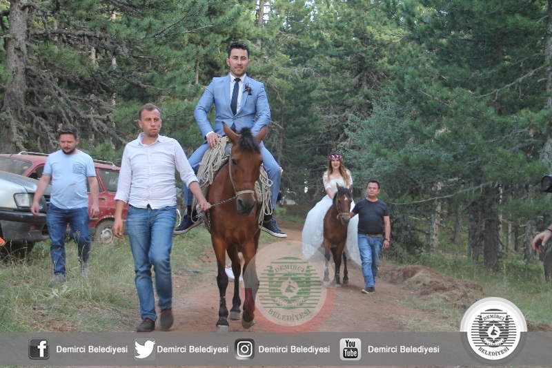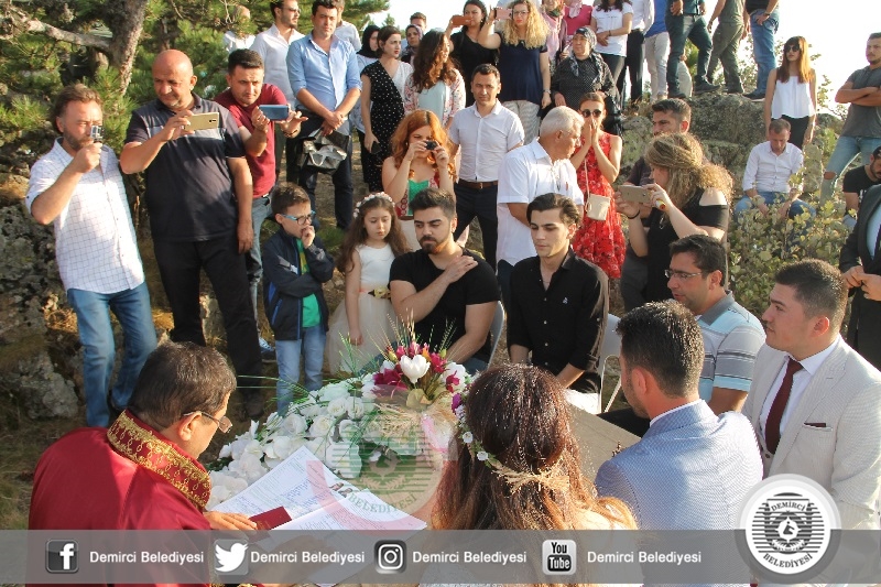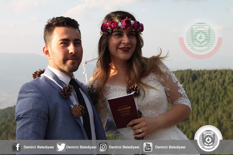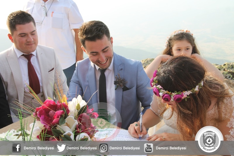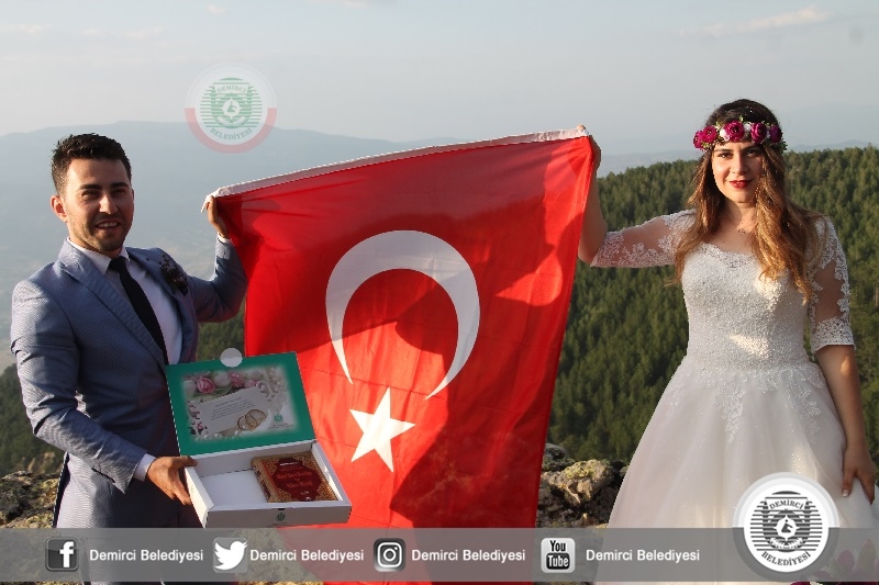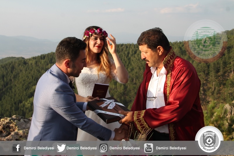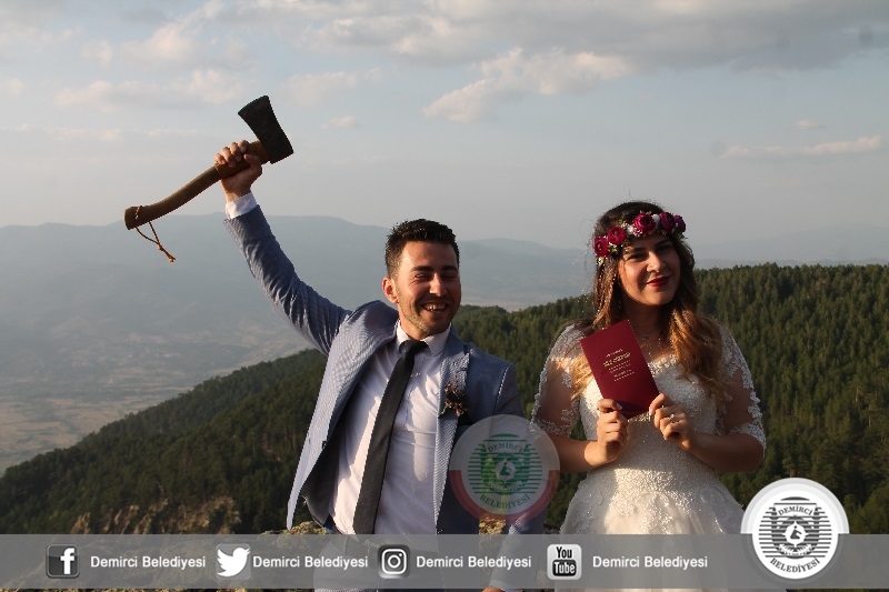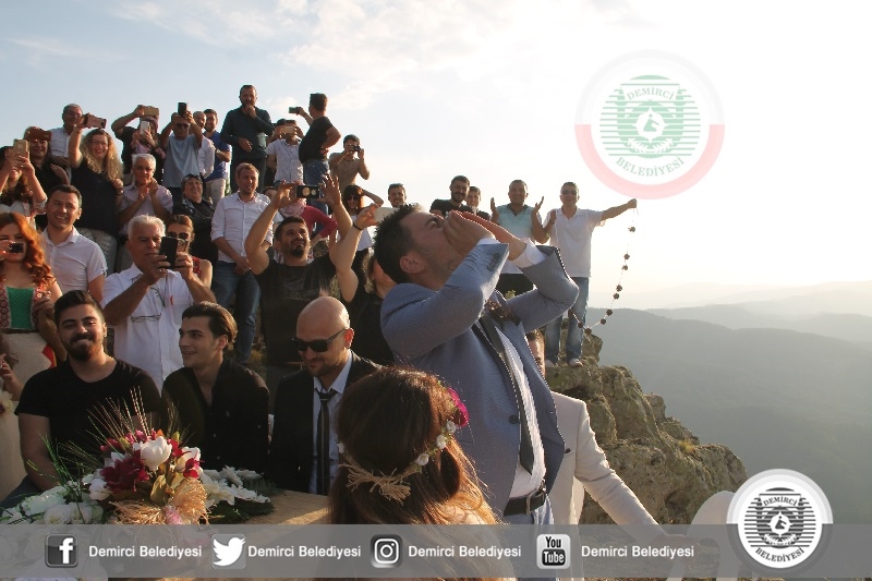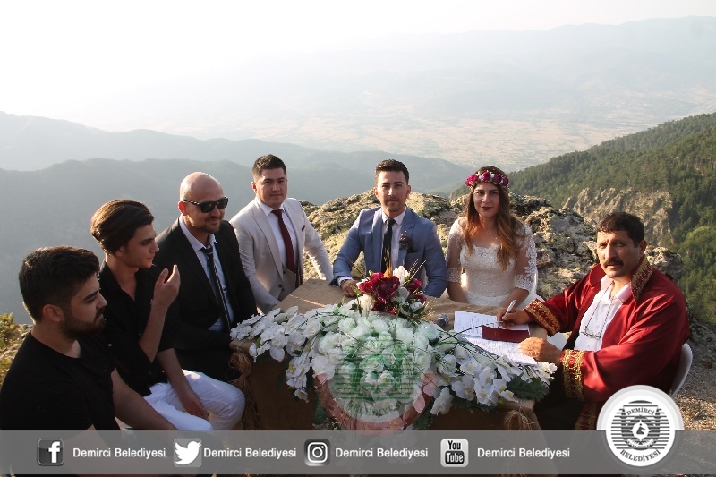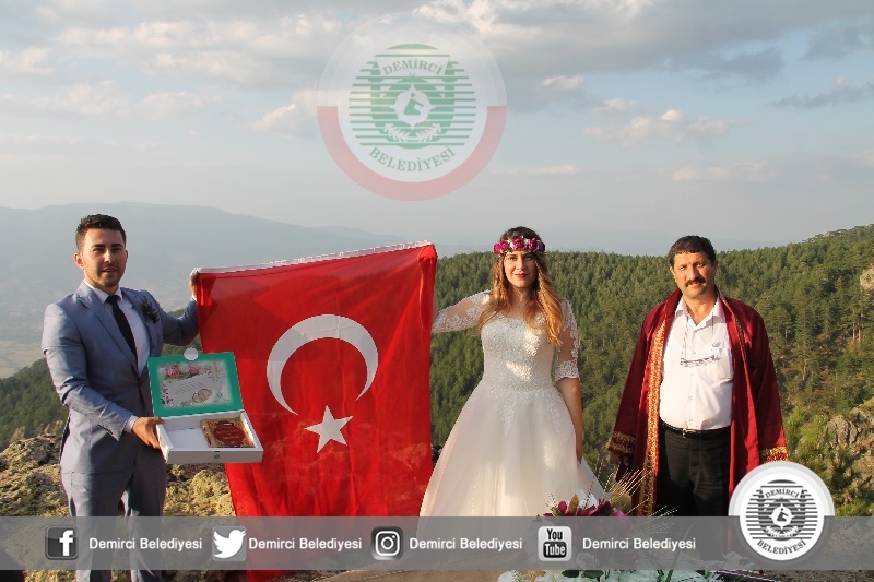 Demirci'de Gökhan Akbal ve Seda Şafak çifti 2 yıl önce doğa gezisi için çıktıkları Demirci – Simav yolu gelin uçtu tepesinde tanıştılar. 2 yıldır sözlülük ve nişanlılığın ardından evlenmeye karar verdiler. Yaklaşık 10 yıldır dağcılık sporu yapan Gökhan ve Seda çifti gelin uçtu tepesinde nikâh kıymak için günlerdir hazırlık yaptılar. Mutlu çift nikâhlarının kıyılacağı tepeye at sırtında gelirlerken, arkadaşları ve misafirleri tarafından meşaleler ile karşılandı.