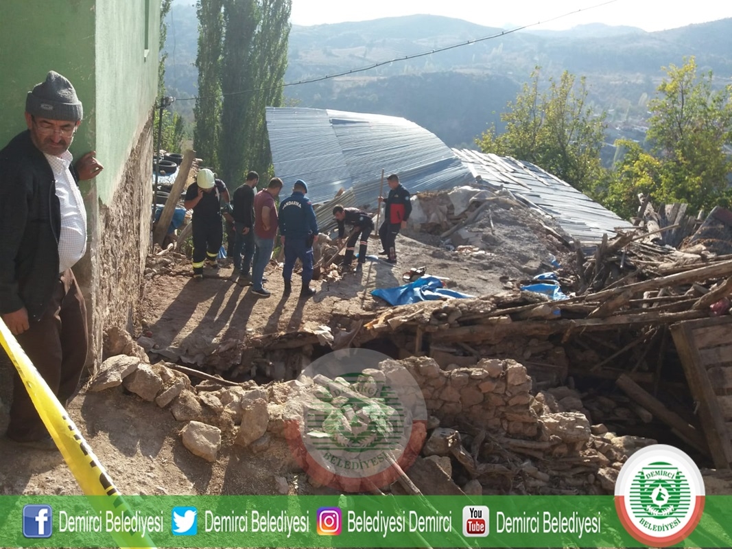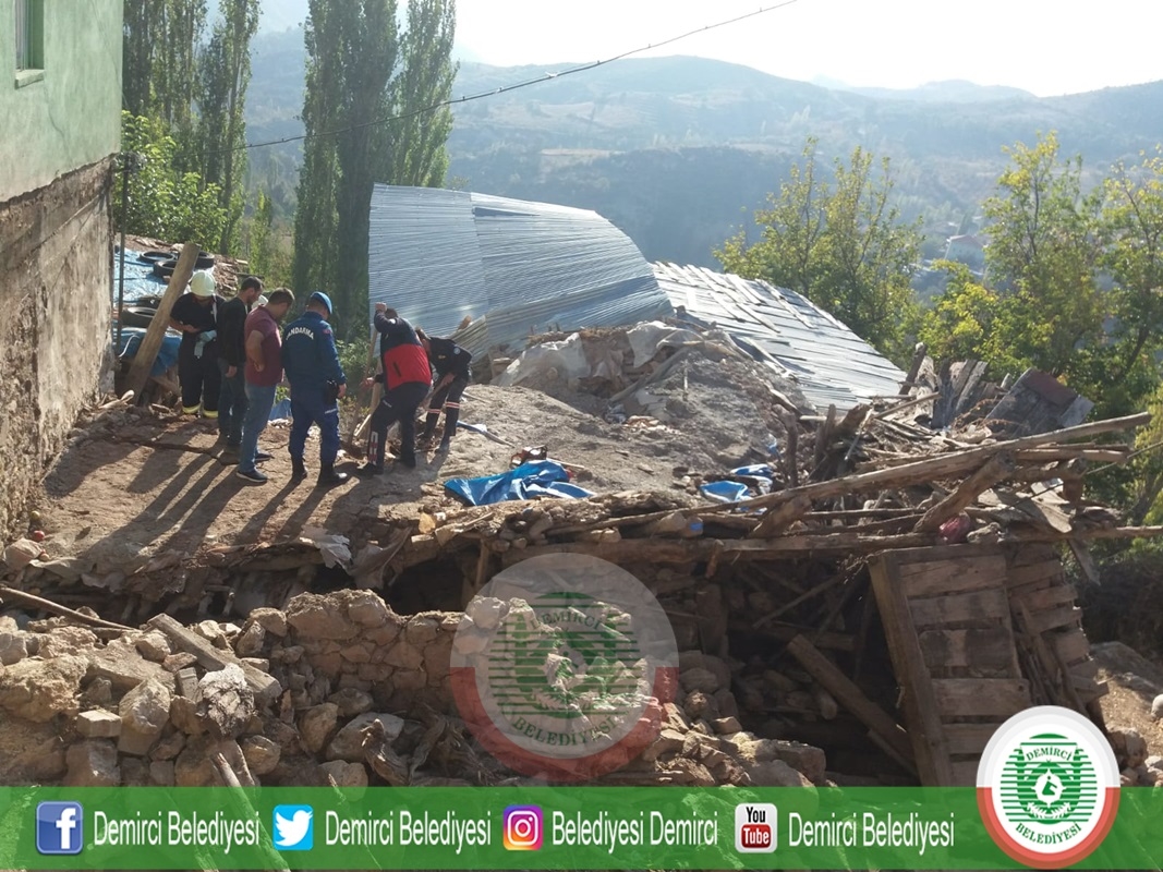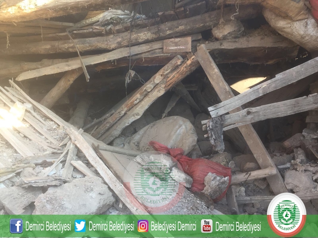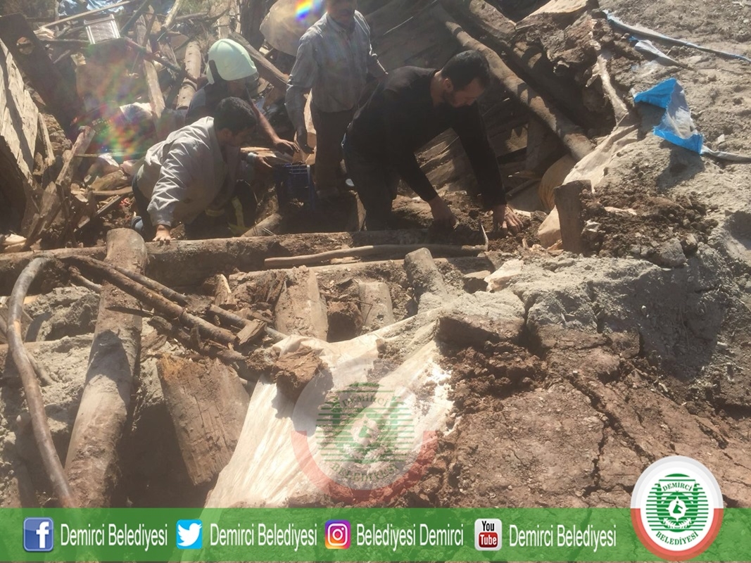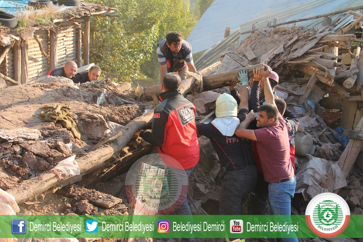 Demirci'de bir evin henüz belirlenemeyen bir nedenden dolayı yıkılması göçük altında kalan bir kişi hayatını kaybederken, 3 büyükbaş hayvanda telef oldu.