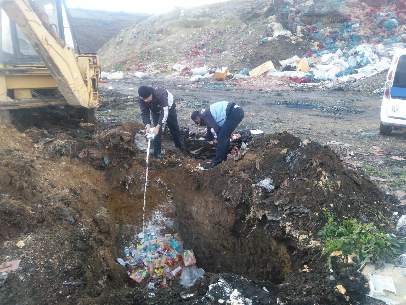 Son kullanma tarihi geçmiş ürünler şehir dışında bulunan hafriyat alanında kontrollü bir şekilde gömülerek imha ediliyor.