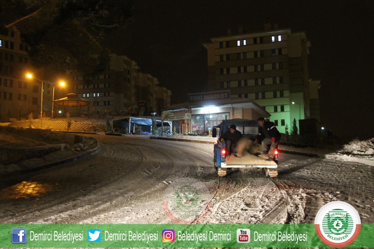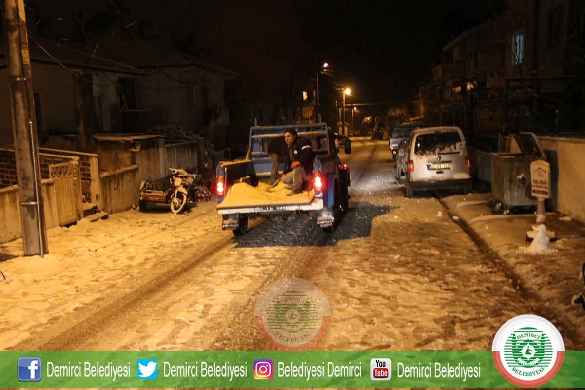 Belediye Başkanı Selami Selçuk yaptığı açıklamada " Kar yağışı ile birlikte ekiplerimiz şehrin her noktasında çalışma yapıyor. Şu an için ilçe merkezimiz de kapalı bulunan yolumuz yok. Gece boyu Fen İşleri ekiplerimiz çalışmalarına ara ara devam edecekler. Demirci Belediyesi olarak 7/24 görevdeyiz " dedi.