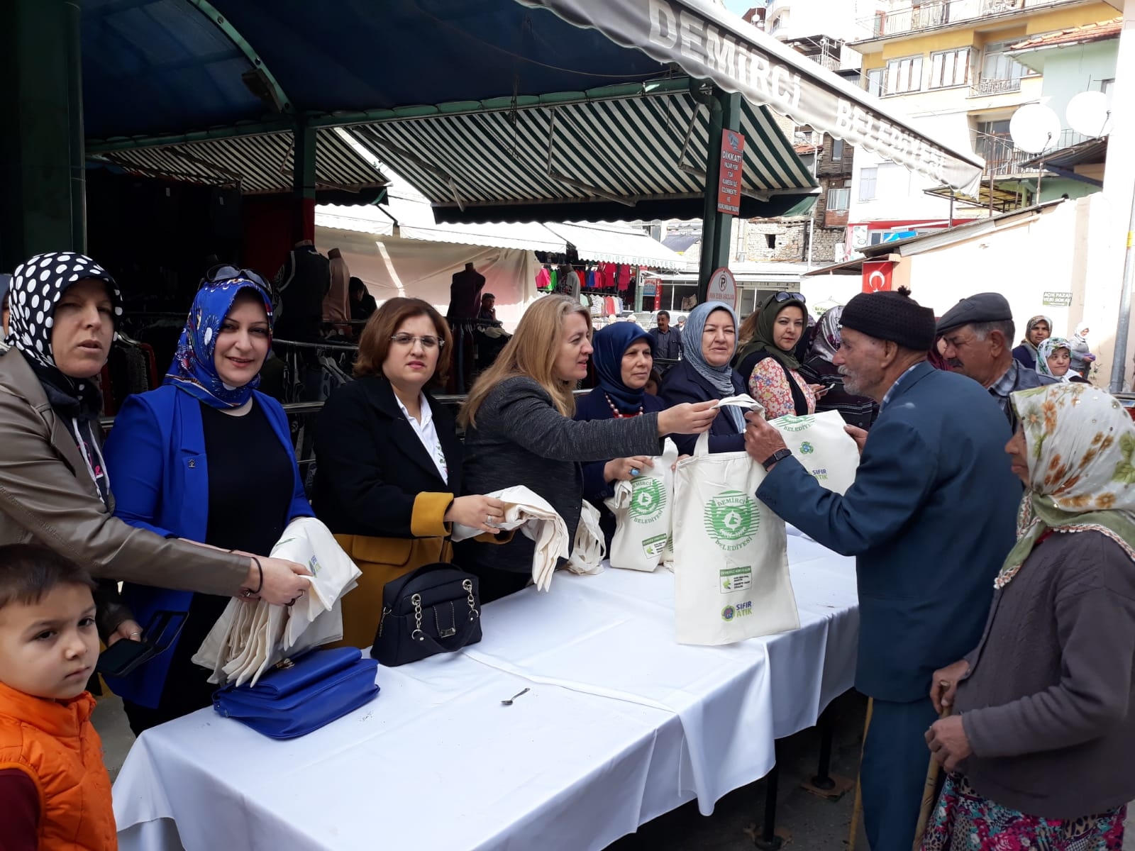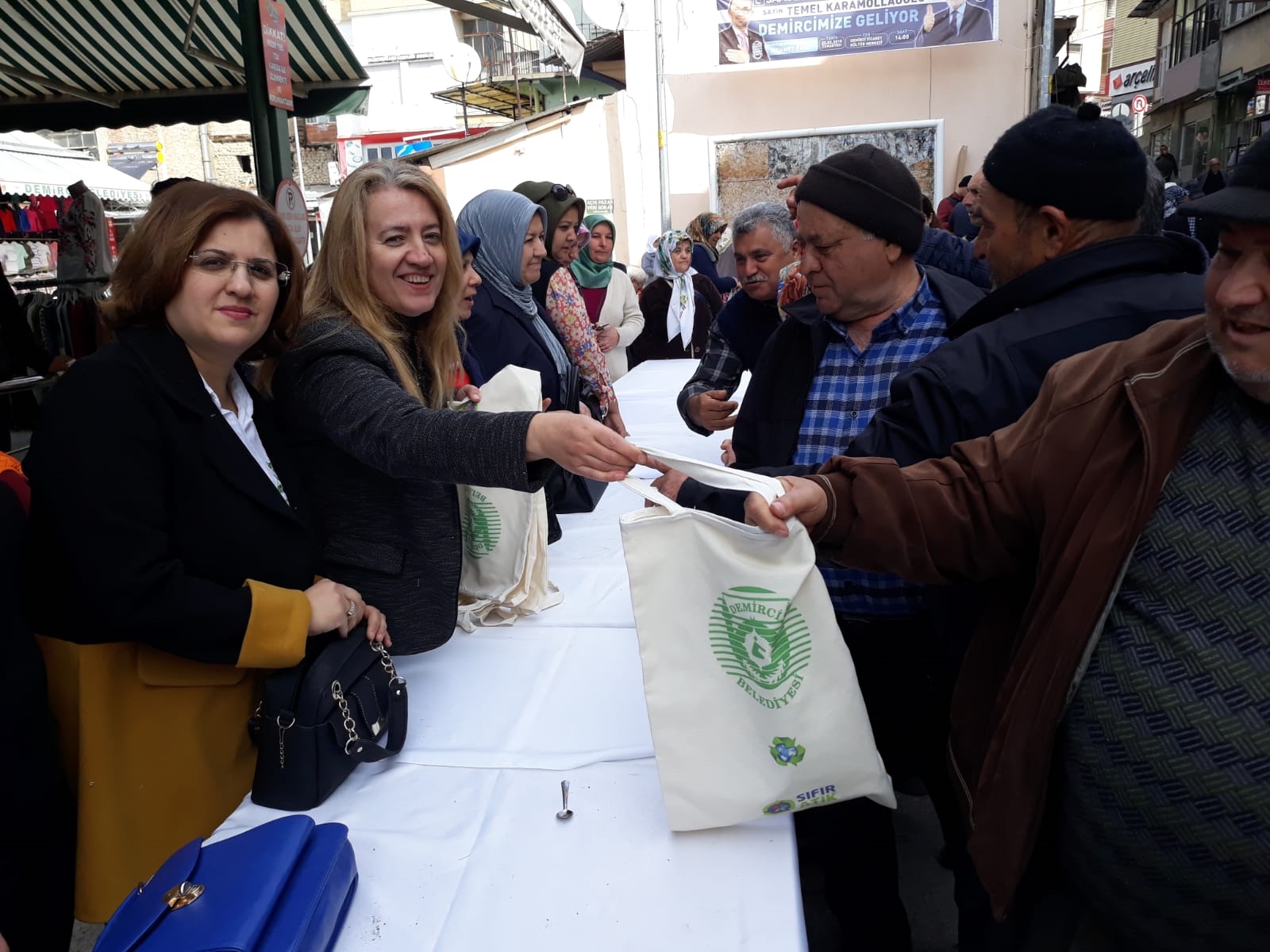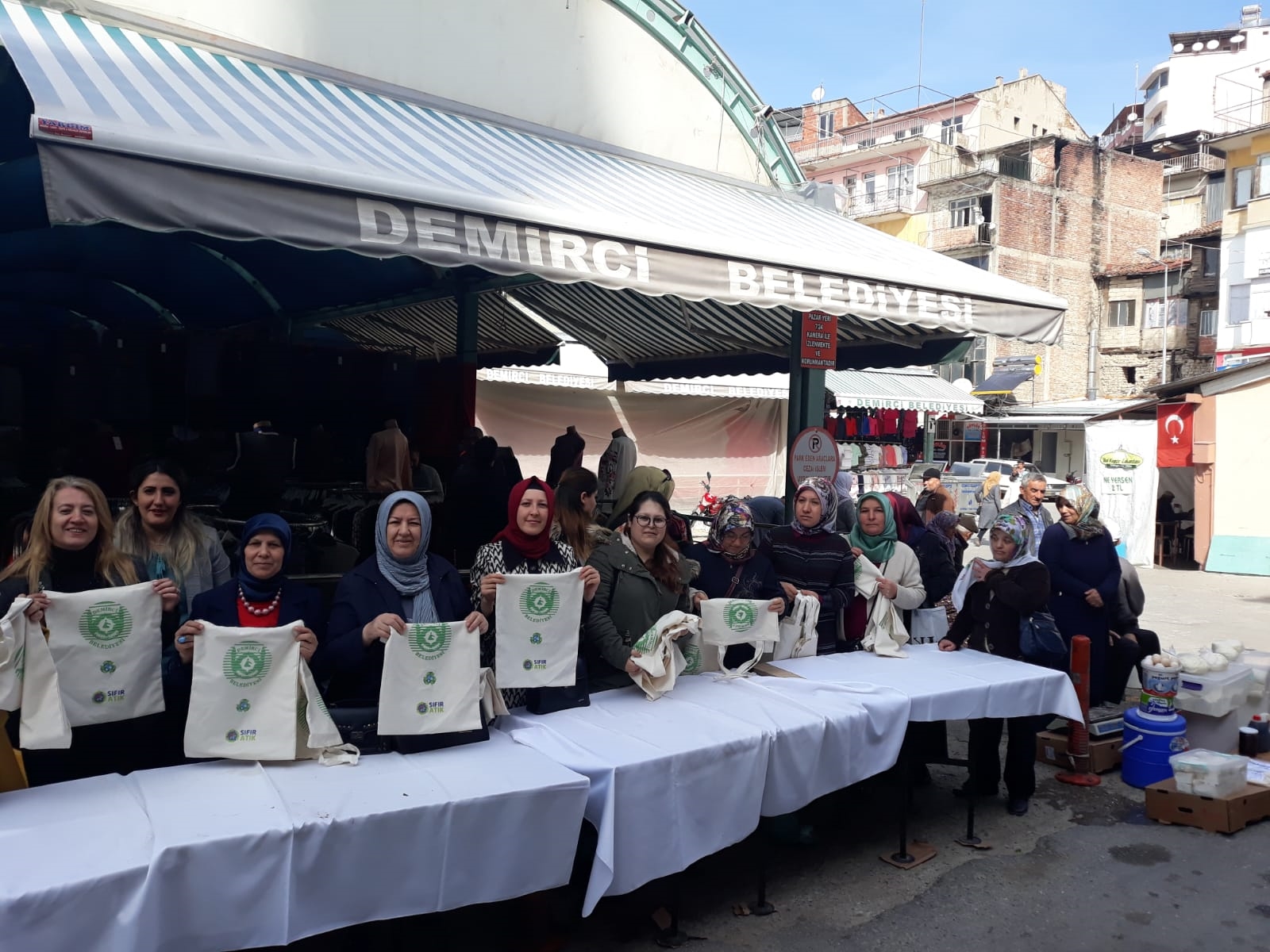 09 Mart 2019 Cumartesi günü de İlçemiz pazaryeri girişinde kurulan stanta Demirci kadınlara Dünya Kadınlar günü anısına saksıda çulha çiçeği, yazma ve bez pazar çantaları hediye edildi.