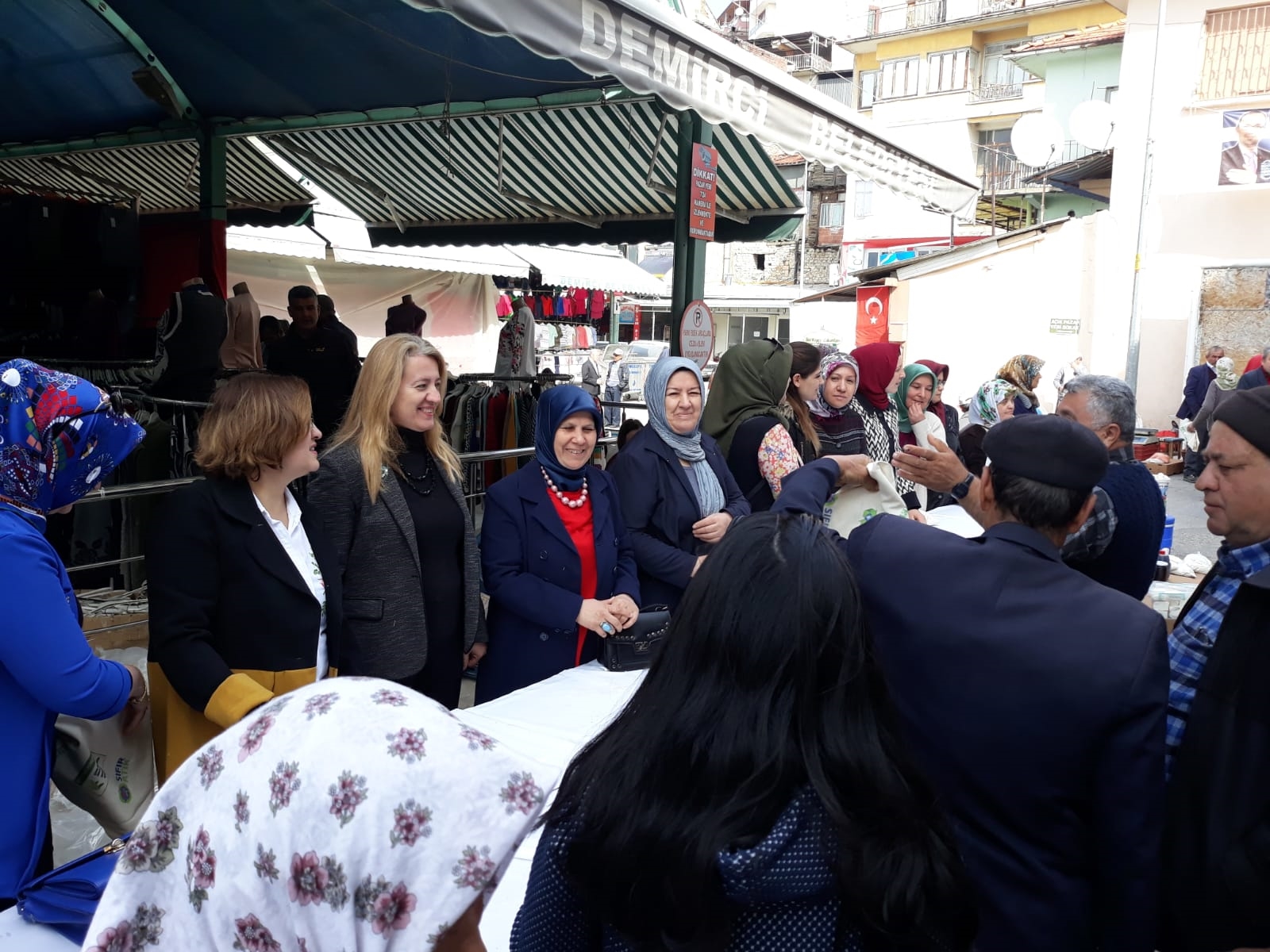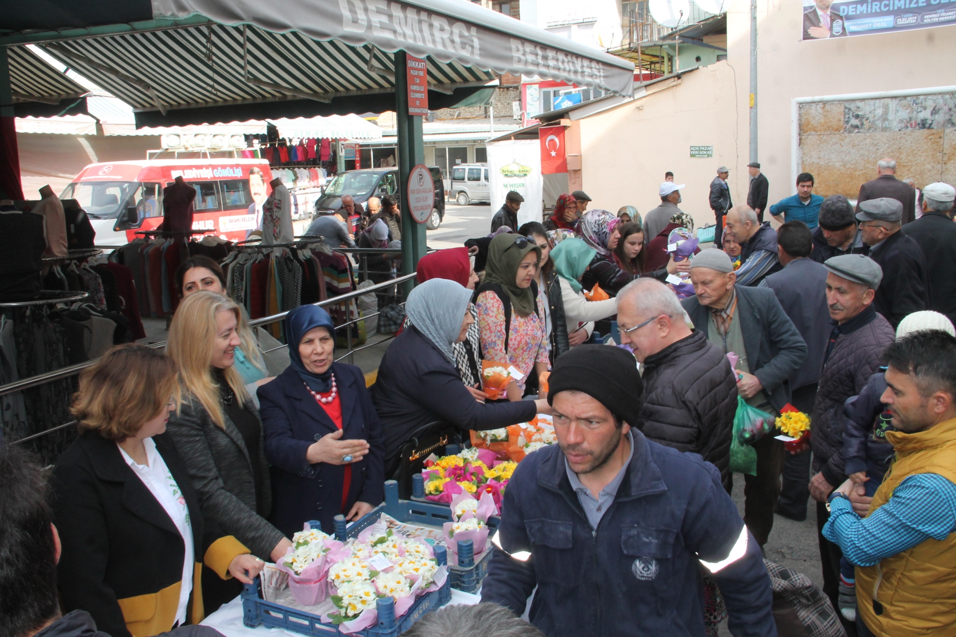 Kurulan stantatta Belediye Başkanı - Cumhur İttifakı AK Parti Demirci Belediye Başkan Adayı Selami Selçuk, eşi Güzide Selçuk, AK Parti ve MHP Kadın Kollarının katılımıyla kadınlara dağıtıldı.
