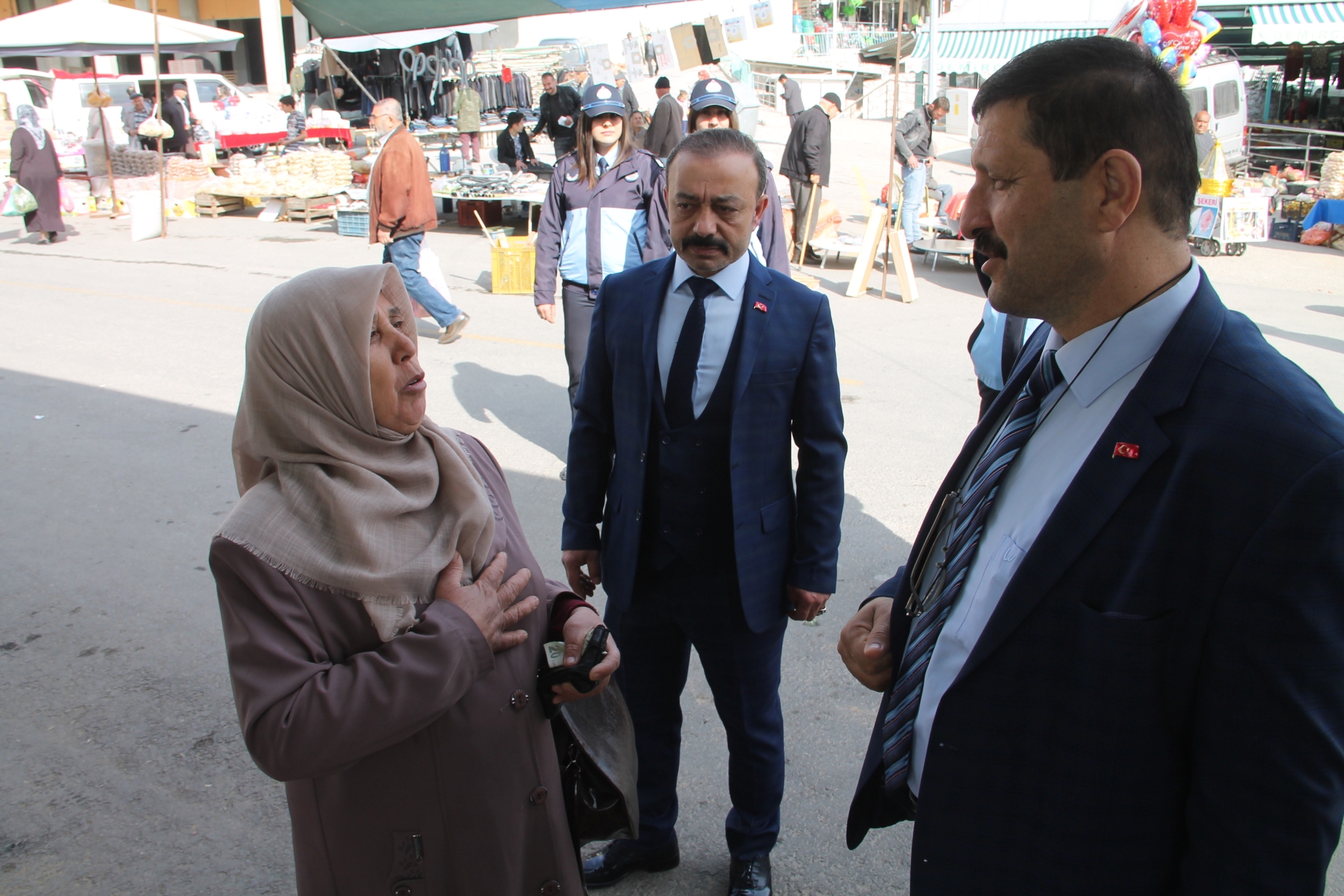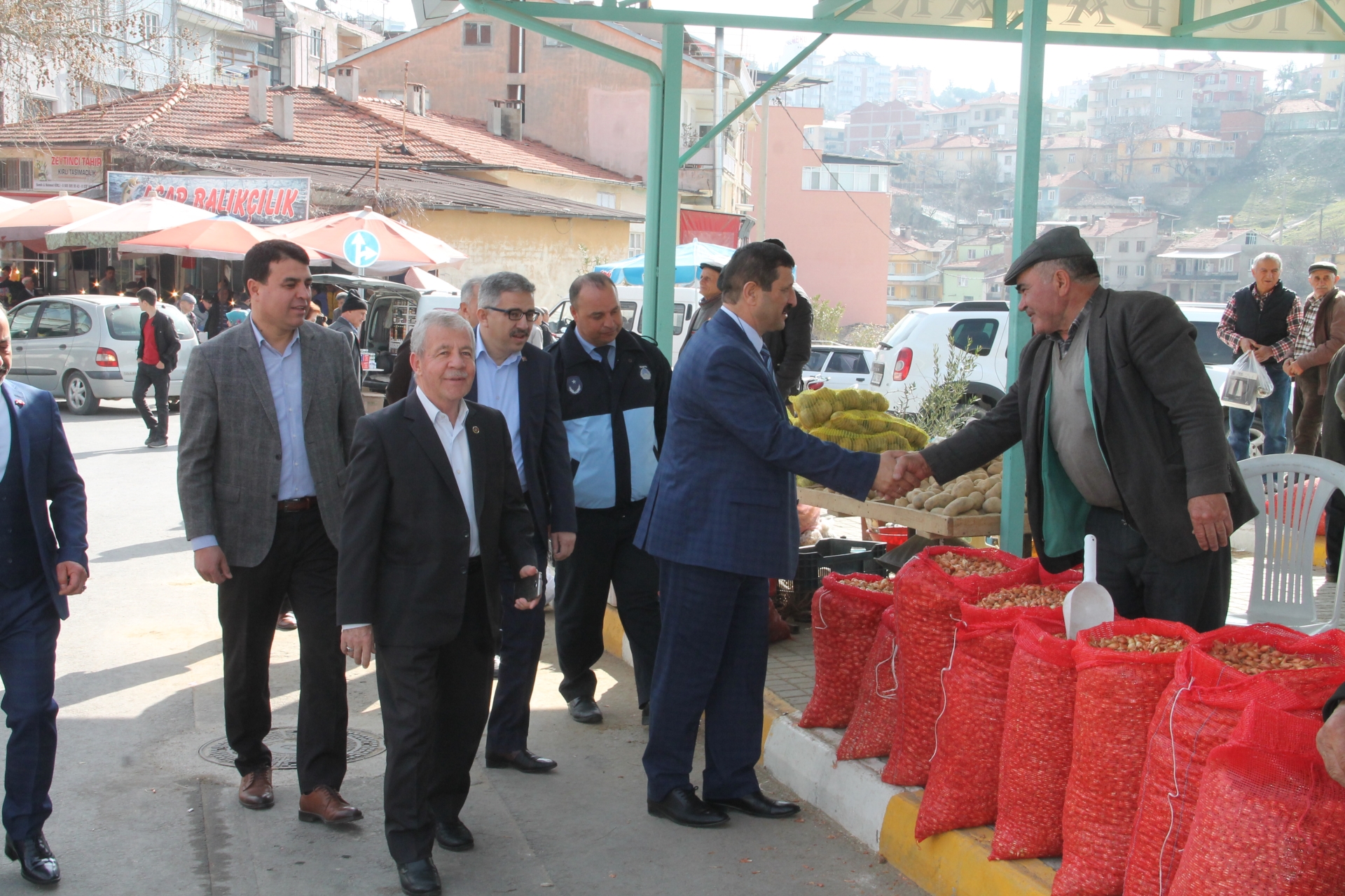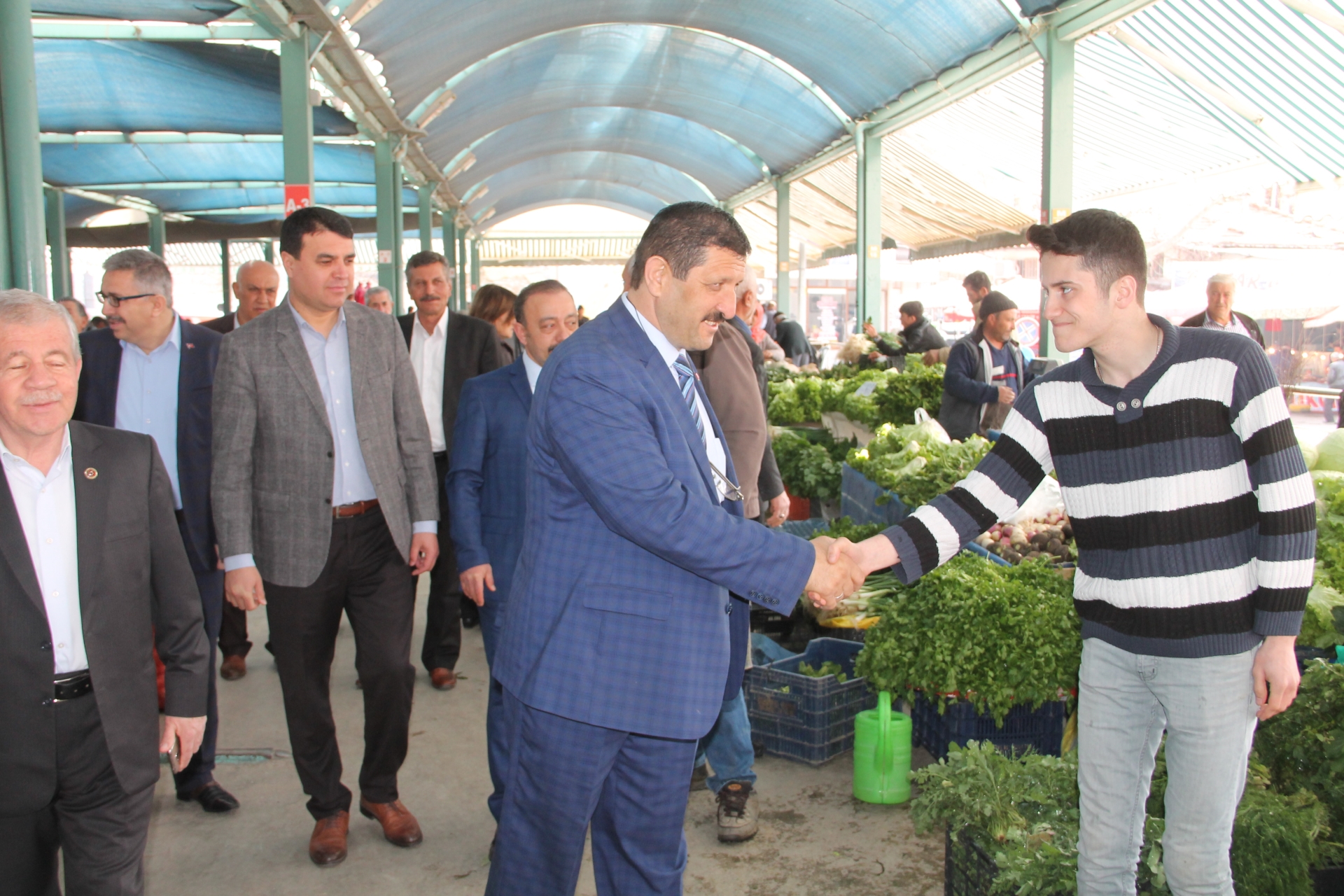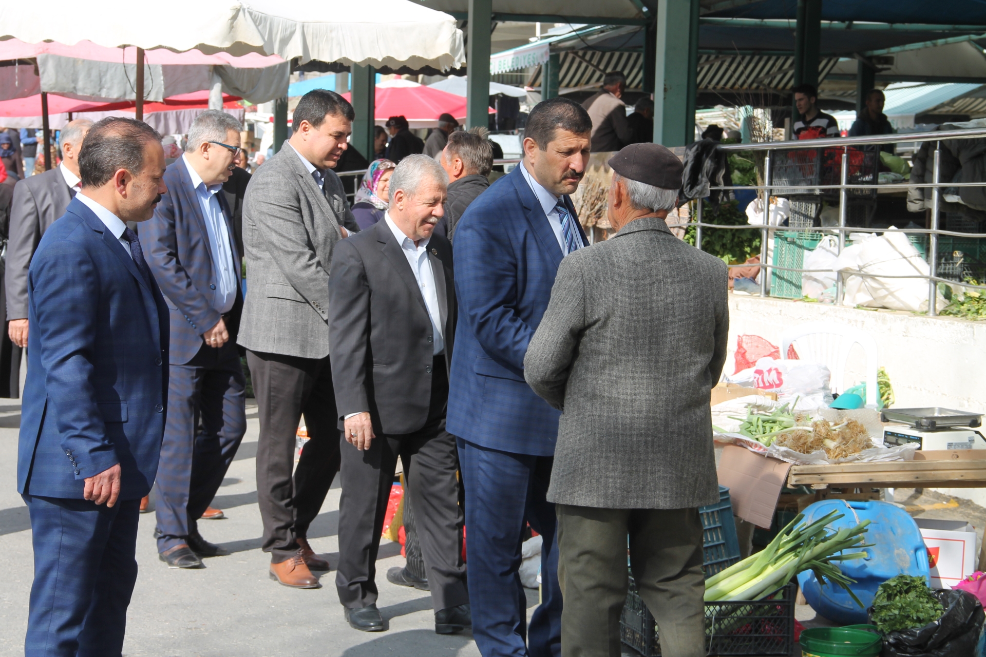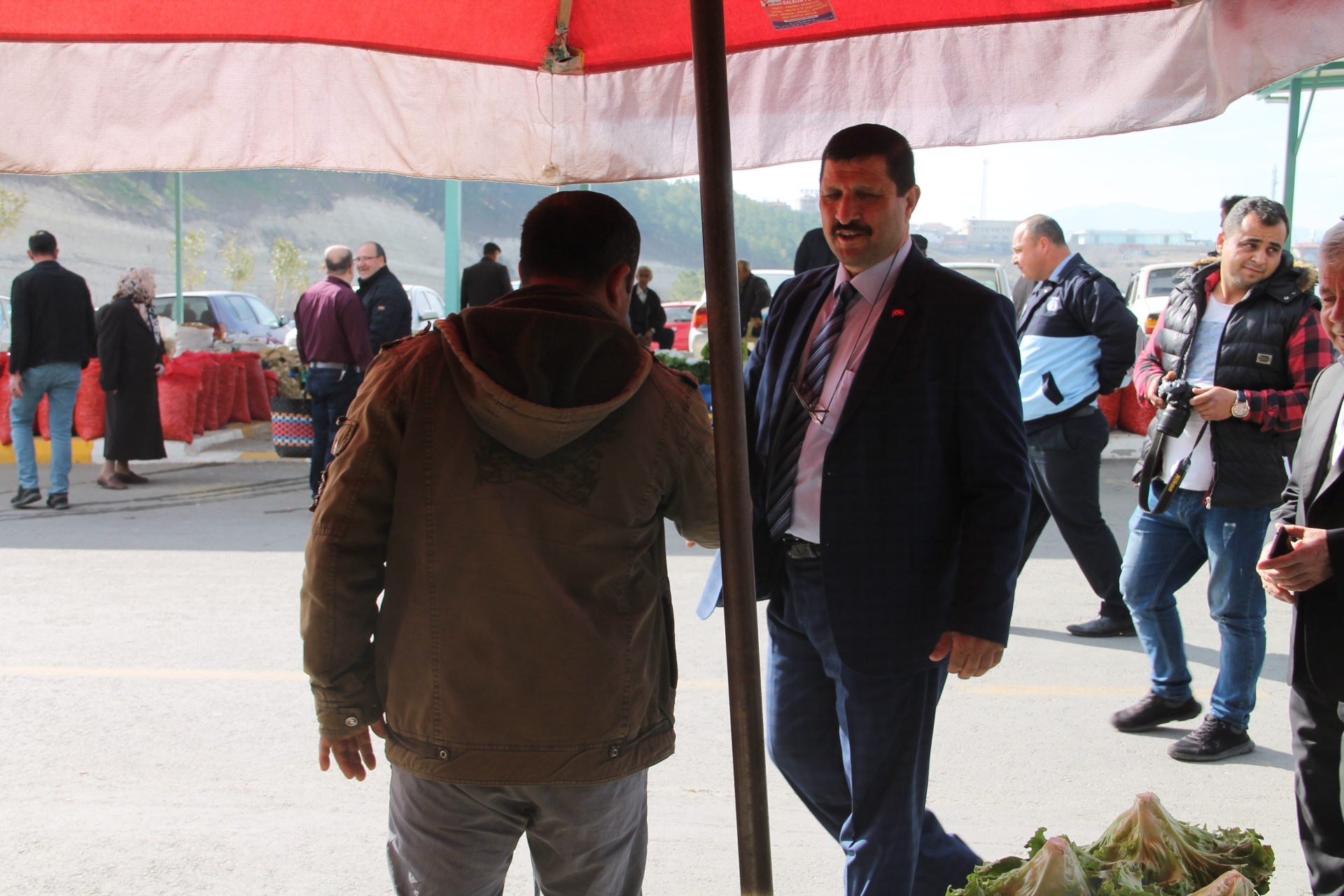 Başkan Selami Selçuk, İlçe Başkanları ve beraberindeki heyet ile birlikte pazarcı esnafını tek tek gezerken, vatandaşlarla da selamlaştılar.