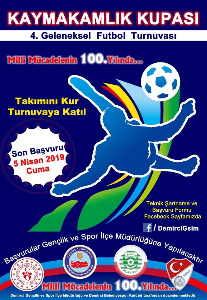 Milli mücadelenin 100.yılı anısına Gençlik ve Spor İlçe Müdürlüğü ve Demirci Belediyespor Kulübü tarafından organize edilen Demirci Kaymakamlığı ve Demirci Belediyesi'nin katkılarıyla hazırlanan 4.Geleneksel Futbol Turnuvası Kaymakamlık Kupası 08 Nisan 2019 Pazartesi günü başlıyor.