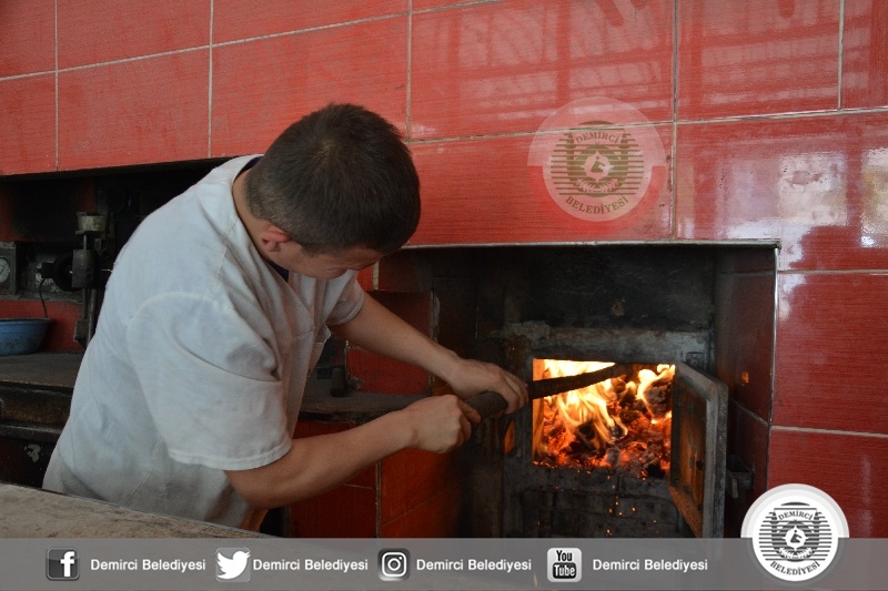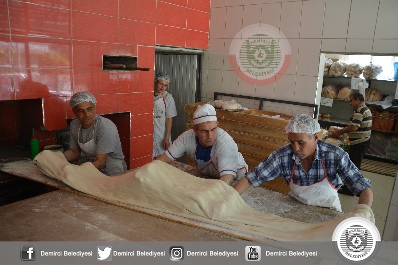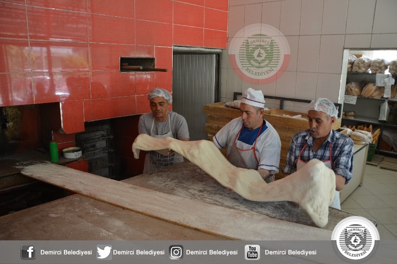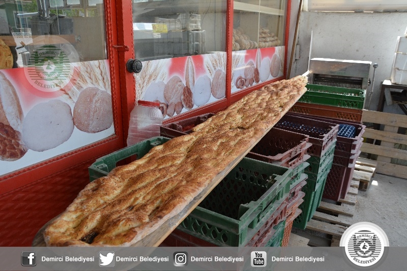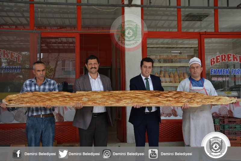 Belediye Başkanı Selami Selçuk'ta, Manisa Büyükşehir Belediyesi Demirci Koordinatörü Gökhan Aslan ile birlikte 3 Metre 20 Santimetre uzunluğunda dev ramazan pidesinin üretildiği fırına geldiler.