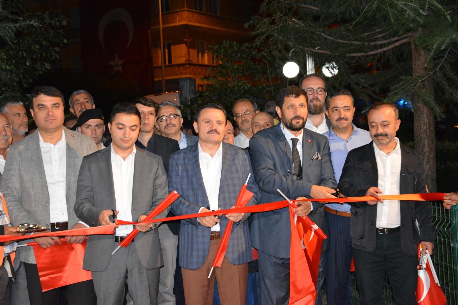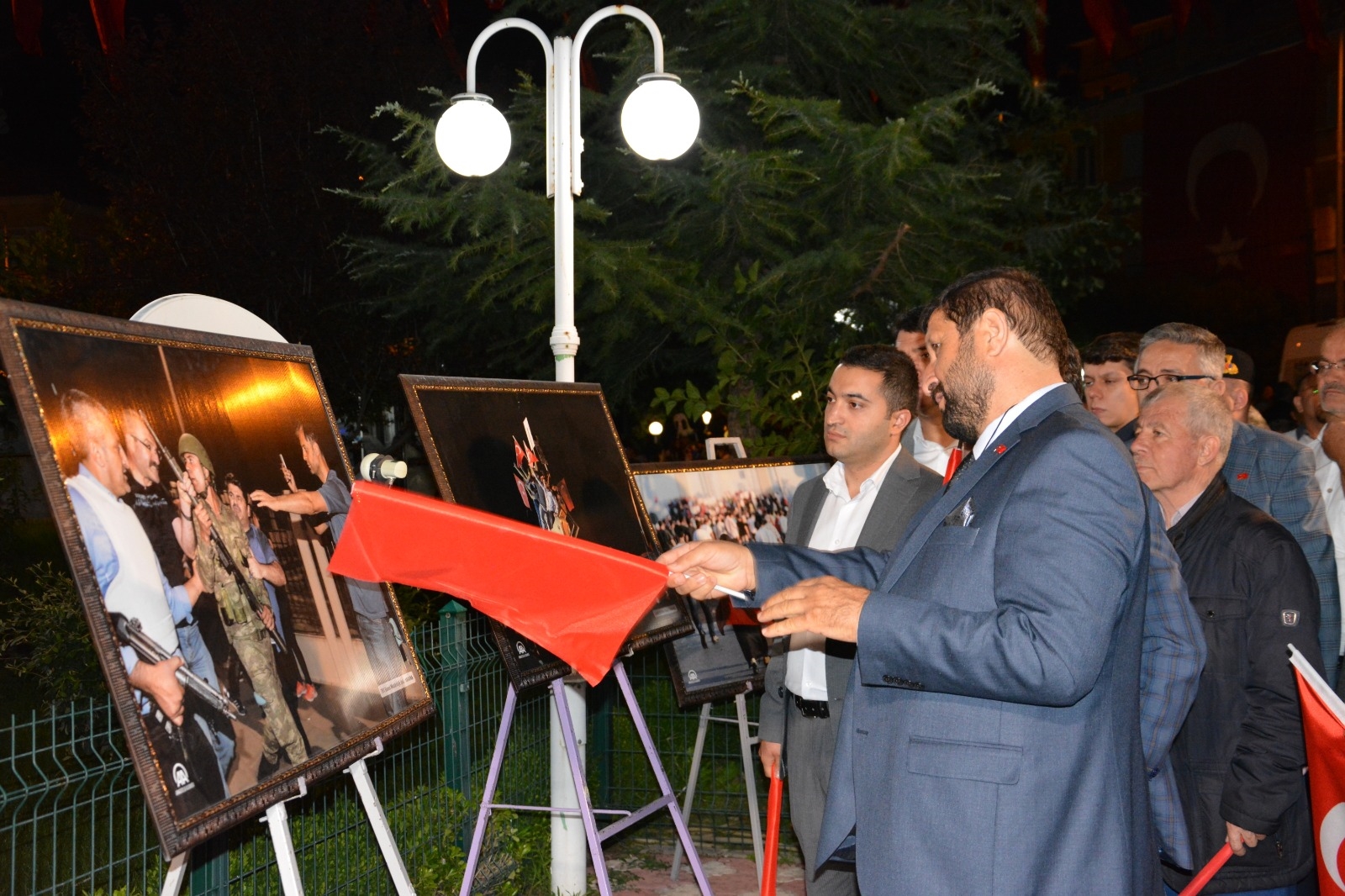 Kaymakam Mutlu Akyol, Belediye Başkanı Selami Selçuk ve beraberindeki protokol üyeleri belediye hizmet binası önünde Anadolu Ajansı 15 Temmuz fotoğraf sergisinin açılış kurdelesini kestiler.