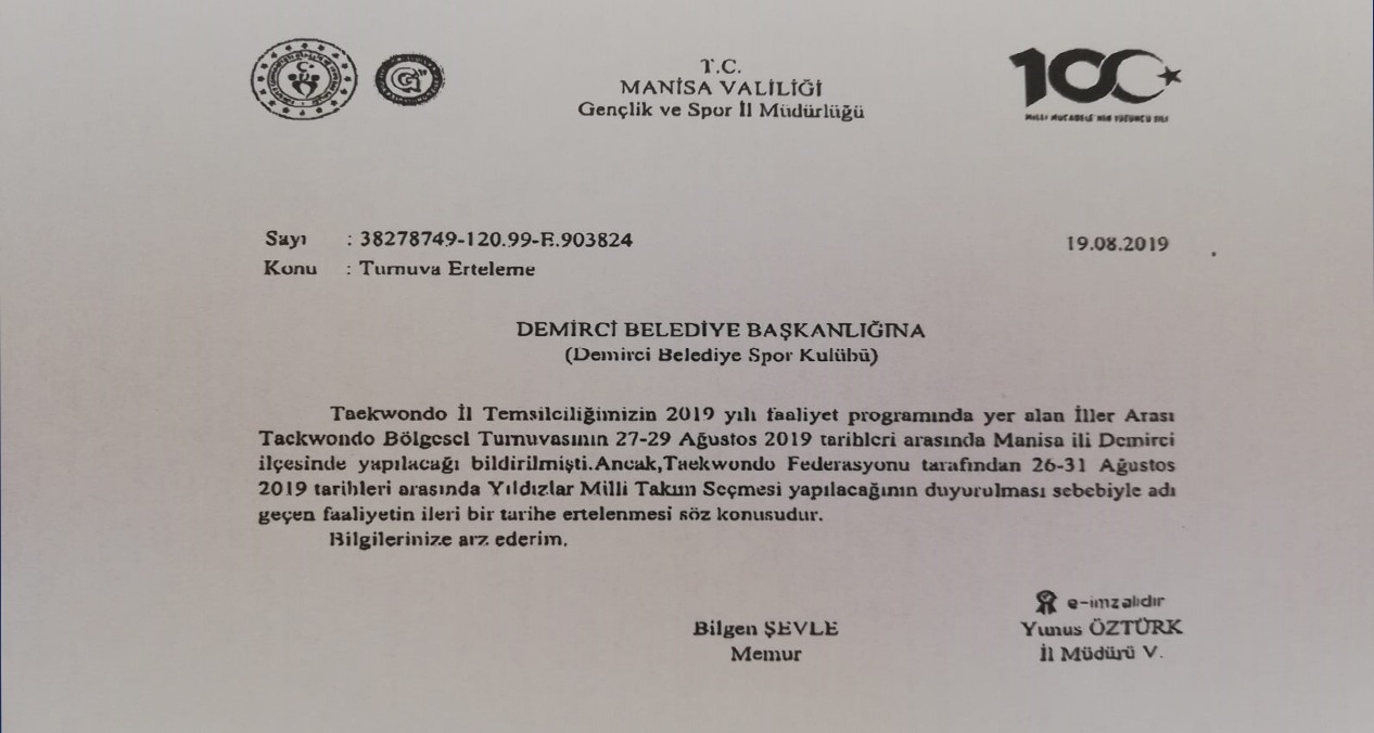 Gençlik ve Spor İl Müdürlüğünden yapılan açıklamaya göre ; Tekvando İl Temsilciliğimizin 2019 yılı faaliyet programında yer alan İller arası Tekvando Bölgesel Turnuvasının 27-29 Ağustos tarihleri arasında Manisa ili Demirci ilçesinde yapılacağı belirtilmişti. Anacak, Tekvando Federasyonu tarafından 26-31 Ağustos 2019 tarihleri arasında Yıldızlar Milli Takım Seçmesi yapılacağının duyurulması sebebiyle adı geçen faaliyetin ileri bir tarihe ertelenmesi söz konusudur " denildi.