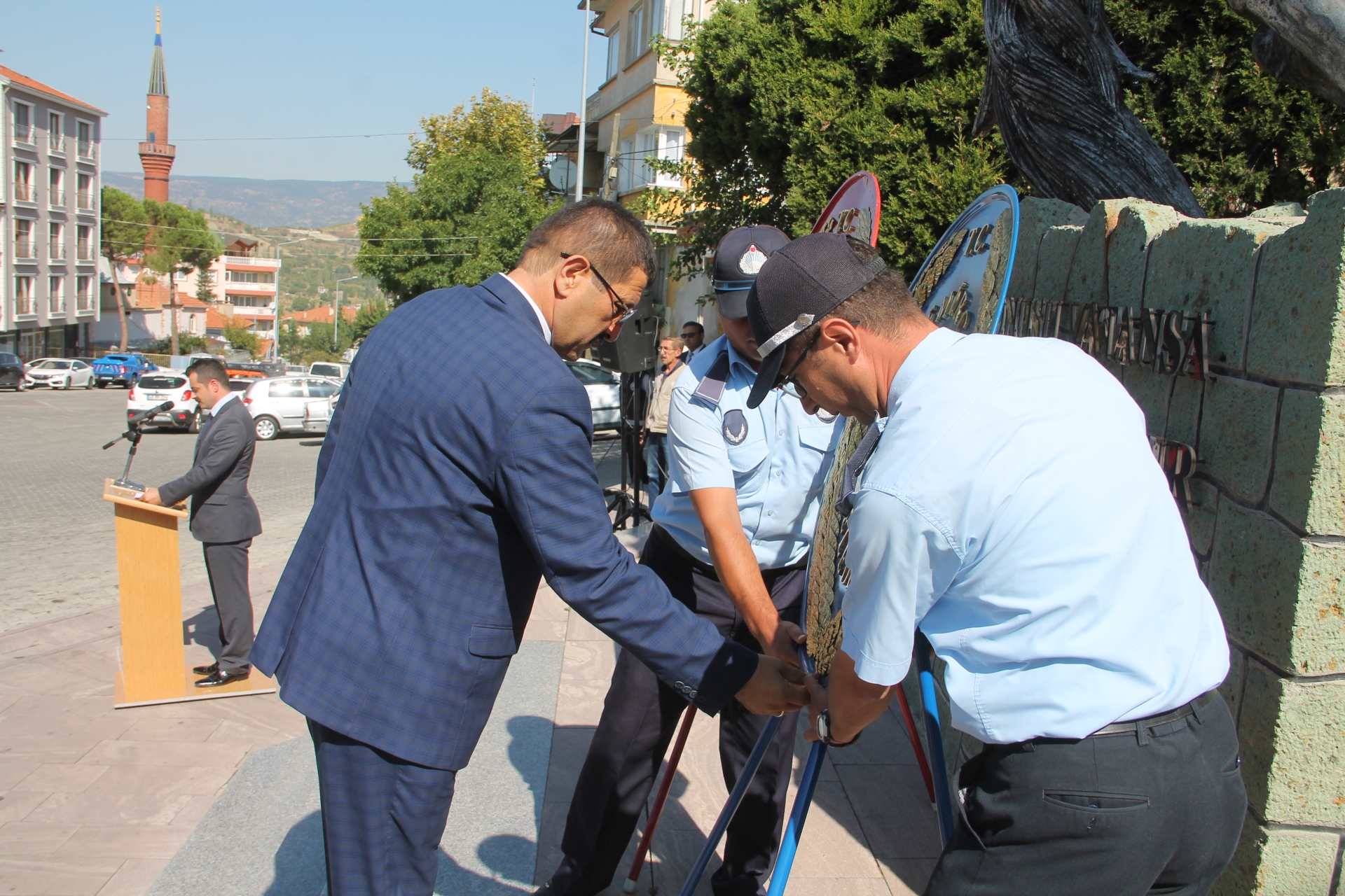 Kaymakamlık makamı, Belediye Başkanlığı ve Muharip Gaziler derneği tarafından Atatürk anıtına çelenklerin sunulmasının ardından saygı duruşu ve İstiklal marşı okundu.