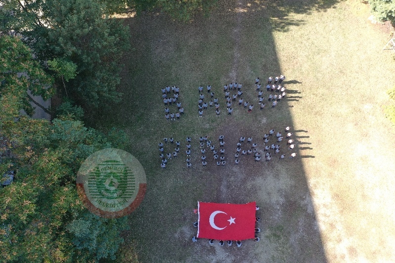Türkiye'nin güney sınırında oluşturulmaya çalışılan terör koridorunu yok etmek, bölgeye barış ve huzur getirmek amacıyla başlatılan Barış Pınarı Harekatına destek olmak isteyen 150 lise öğrencisi, okul bahçesine "Barış Pınarı" yazısı çıkacak şekilde sıralanarak Türk bayrağı açtı.