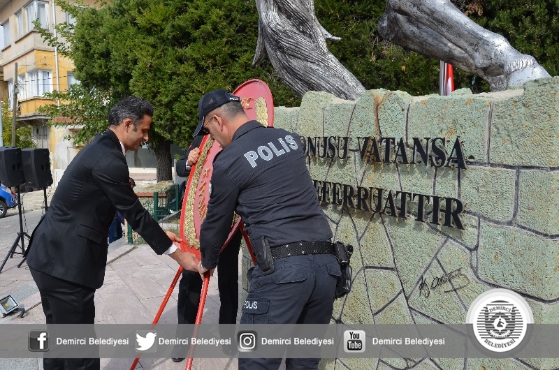 Demirci Kaymakamı Adem Kaya ve Belediye Başkanı Selami Selçuk tarafından Atatürk anıtına çelenklerin sunulmasının ardından saygı duruşu yapılması ve İstiklal Marşı’nın okunmasıyla tören sona erdi.