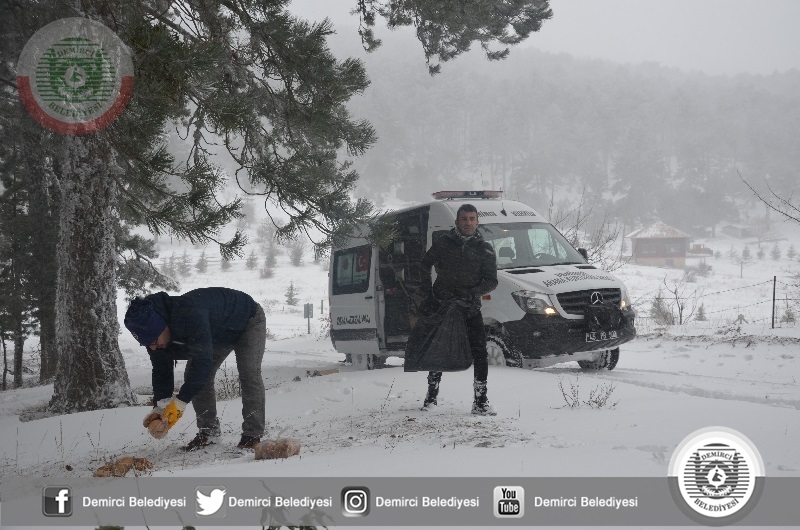 Demirci'de hüküm süren zorlu kış şartları ve etkili kar yağışı nedeniyle Demirci - Simav karayolun mahsur kalan kamyon ve araçlar ekipler tarafından kurtarılırken, yiyecek bulmakta zorlanan yaban hayvanları için ormana et ve yiyecek bırakıldı.