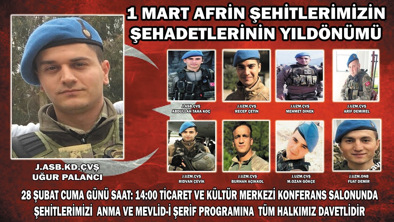 01 Mart 2018 tarihinde Zeytin Dalı Hareketında Şehit düşen Astsubay Uğur Palanci ve Afrin Şehitlerimiz anısına anma programı ve mevlid-i şerif programı düzenlenecek.