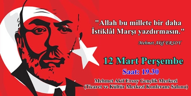 12 Mart Perşembe akşamı saat 19:30'da Mehmet Akif Ersoy Gençlik Merkezi (Ticaret ve Kültür Merkezi konferans) salonunda yapılacak olan İstiklal Marşımızı Güzel Okuma yarışmasına tüm halkımız ve öğrencilerimiz davetlidir.
