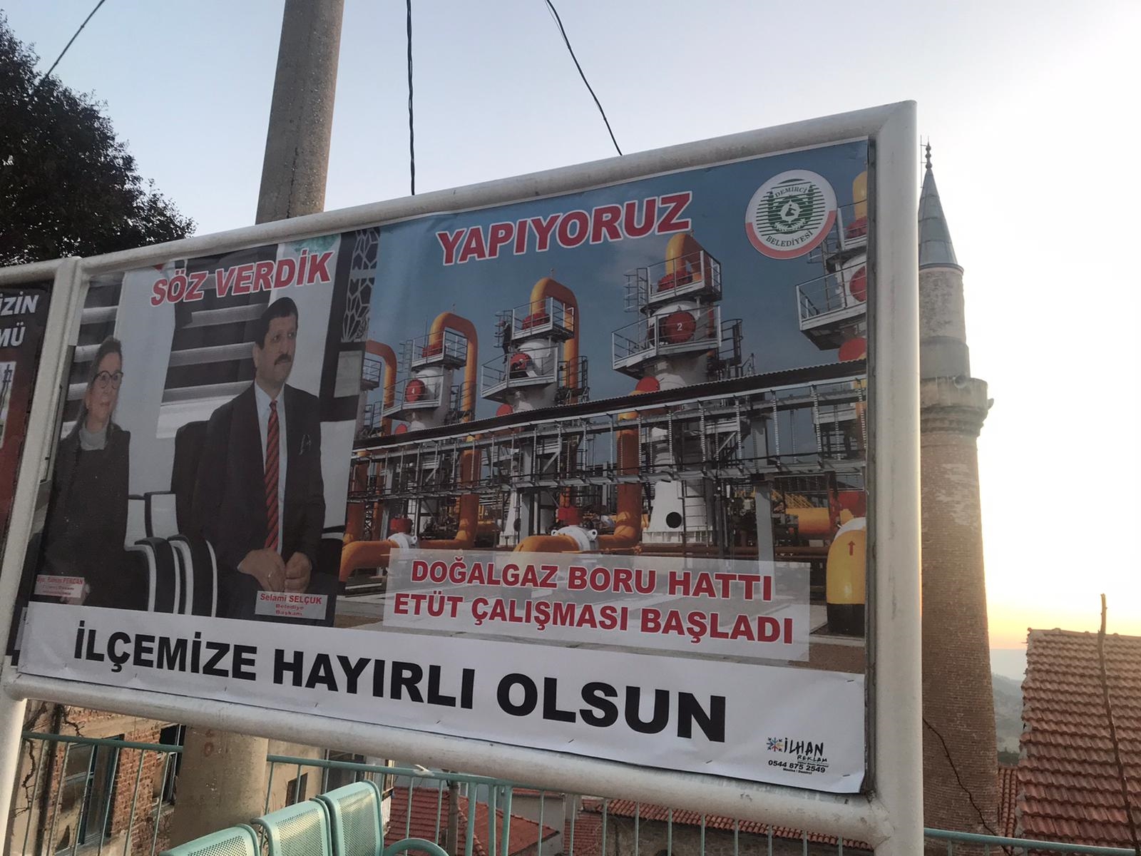 Demirci'ye yapılacak olan Doğalgaz yatırımı etüt çalışması billboardlarda yerini aldı. Vatandaşlarda yapılacak olan Doğalgaz yatırımından memnuniyet duyduklarını ifade ettiler.