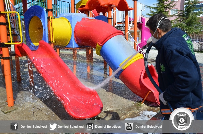 20 Mart Cuma günü Demirci Belediyesi Temizlik İşleri ekiplerince İlçedeki çocuk oyun parklarında çocuk oyun grupları deterjanla yıkanarak dezenfekte edildi. Diğer yandan belediye tankeri ile köpüklenen çocuk oyun grupları yıkandı.