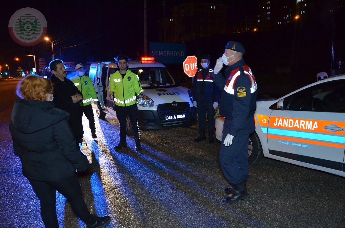 Demirci ilçesinde korona virüs (Kovid-19) tedbirleri çerçevesinde ilçe girişinde uygulama yapan görevleri ziyaret eden Belediye Başkanı Selami Selçuk, hünnap, baklava ve elma ikramında bulundu.