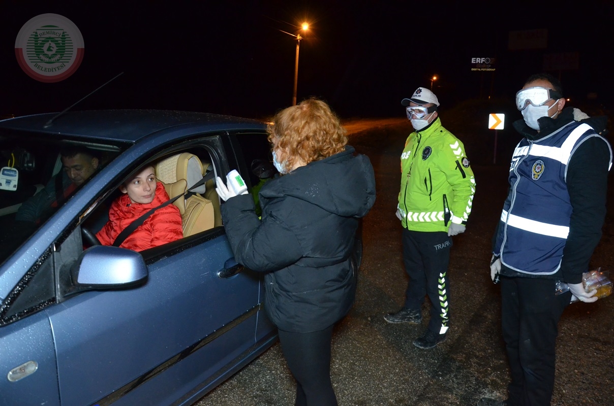 Demirci - Simav karayolu Demirci girişinde ilçeye girişlerde kontrol yapan emniyet ve jandarma görevlerinin yanı sıra sağlık görevlileri tarafından da sürücülerin ve yolcuların ateşleri ölçülerek ilçeye alınıyor.