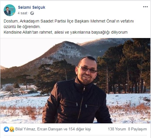 Başkan Selami Selçuk " Dostum, Arkadaşım Saadet Partisi İlçe Başkanı Mehmet Önal’ın vefatını üzüntü İle öğrendim.