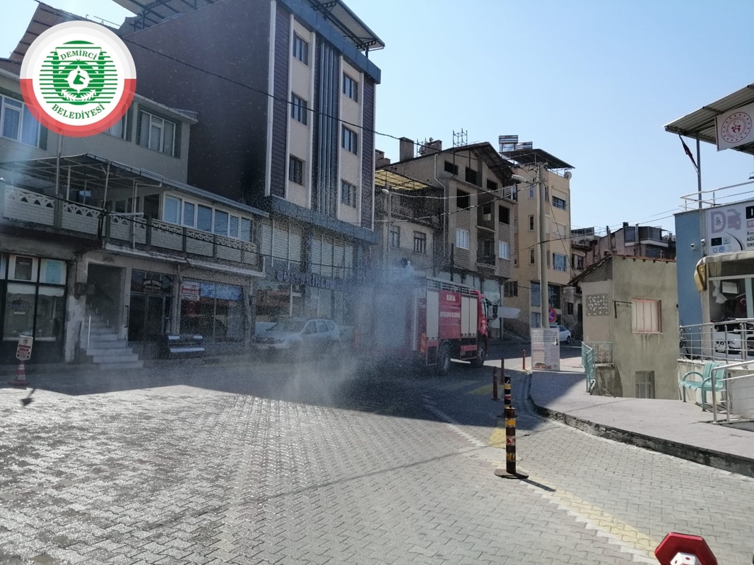 Demirci'de Büyükşehir Belediyesi İtfaiye ekipleri'de sokakların ve caddelerin sakinleşmesinden dolayı ilçe merkezi cadde ve sokaklarında dezenfekte çalışması gerçekleştirdi.