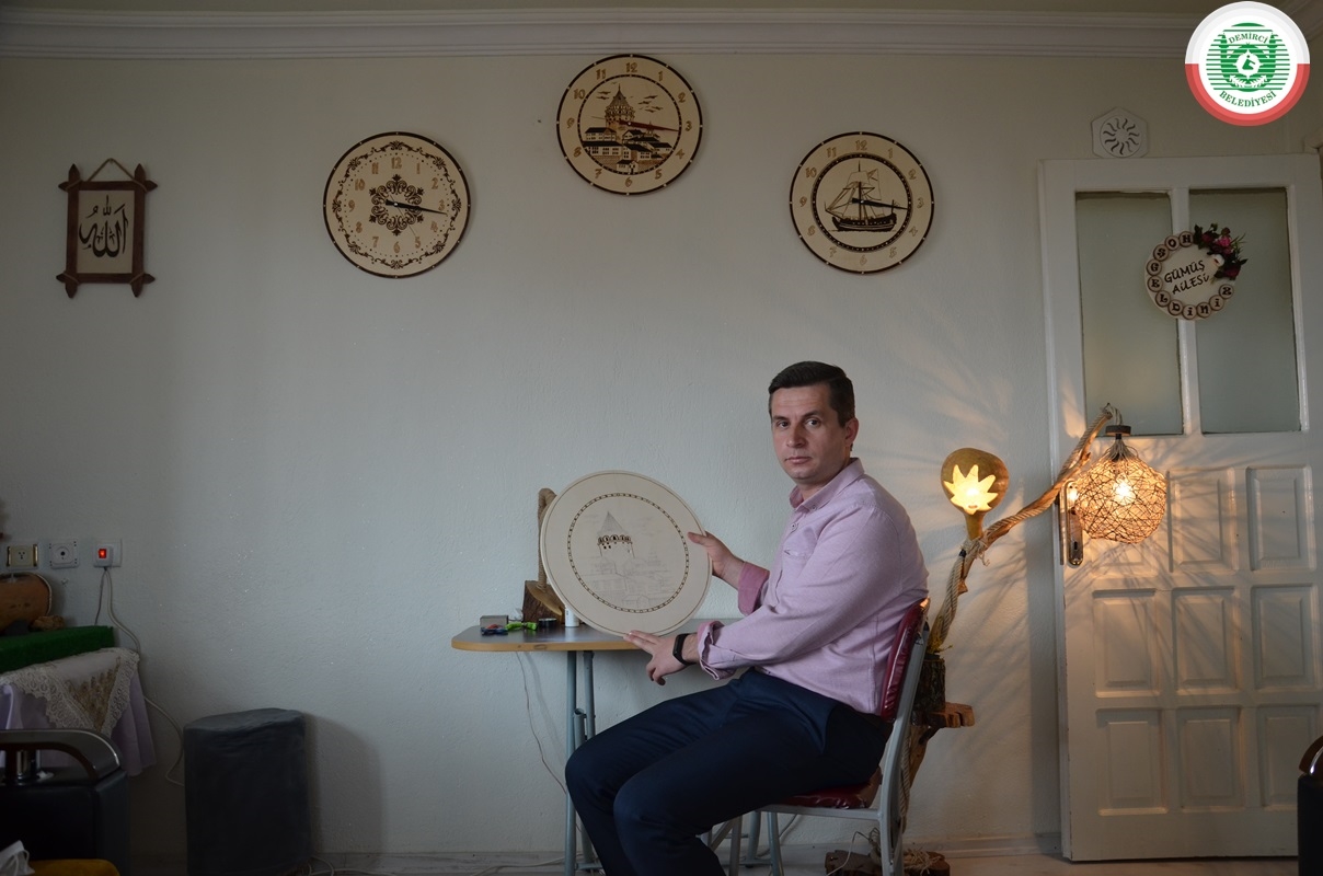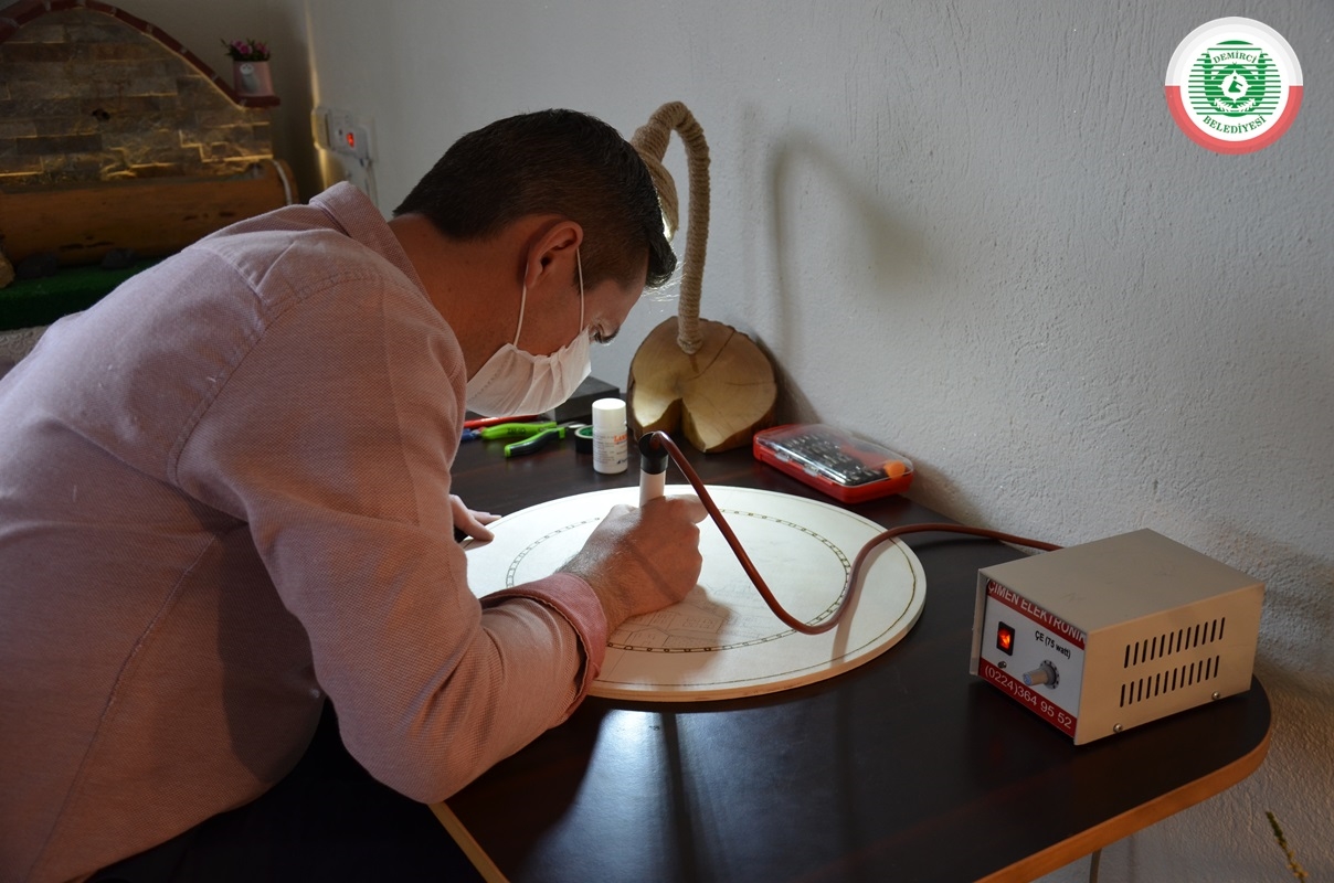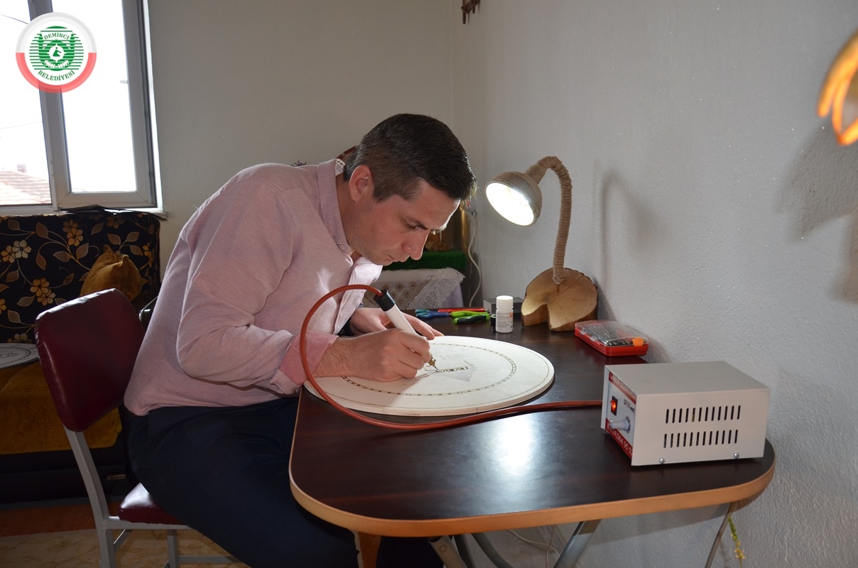 İlçeye bağlı Bardakçı Mahallesi'nde 8 yıldır imam hatip olarak görev yapan 3 çocuk babası Muharrem Gümüş, boş zamanlarını değerlendirmek amaçlı ahşap yakmada bazen hazır motiflerin, bazen de kendi çizimlerinin üzerine ahşap yakma tekniği uyguluyor.