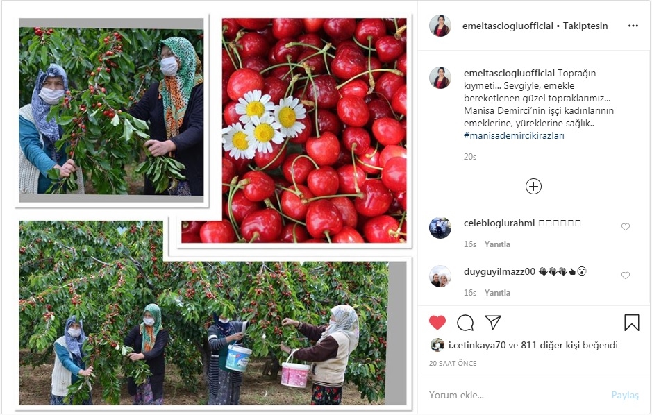 TRT Sanatçısı, Türk Halk Müziğine yıllarını veren Emel Taşçıoğlu'da Demirci'nin Kiraz üretimine destek vererek, Danışment Mahallesinde yapılan kiraz hasadının fotoğraflarını şahsi ınstagram hesabından paylaşarak Demirci'ye selamlarını iletti.