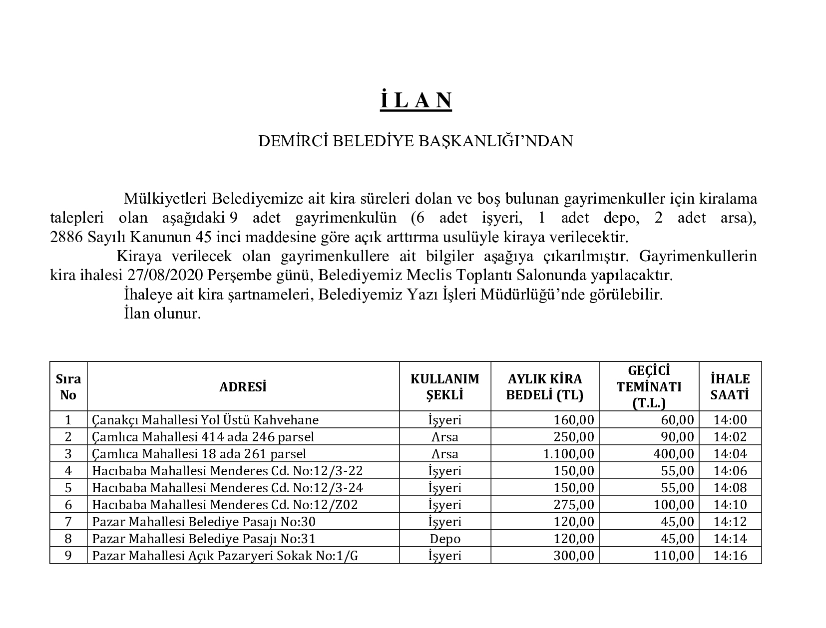 Mülkiyeti Demirci Belediyesine ait işyeri, depo ve arsaların yer aldığı gayrimenkuller için kira ihalesi yapılacak.