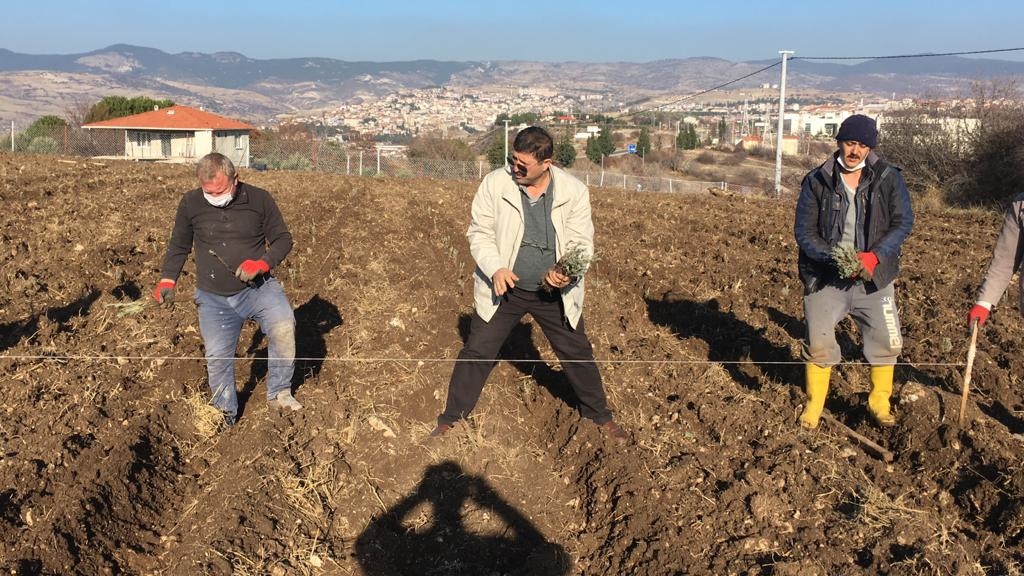 20 Aralık Pazar günü Demirci Kaymakamı Adem Kaya ve Belediye Başkanı Selami Selçuk'ta, Salihli karayolu çakal alanı mevkinde Yusuf Demir'e ait araziye giderek lavanta fidesini toprakla buluşturdular.