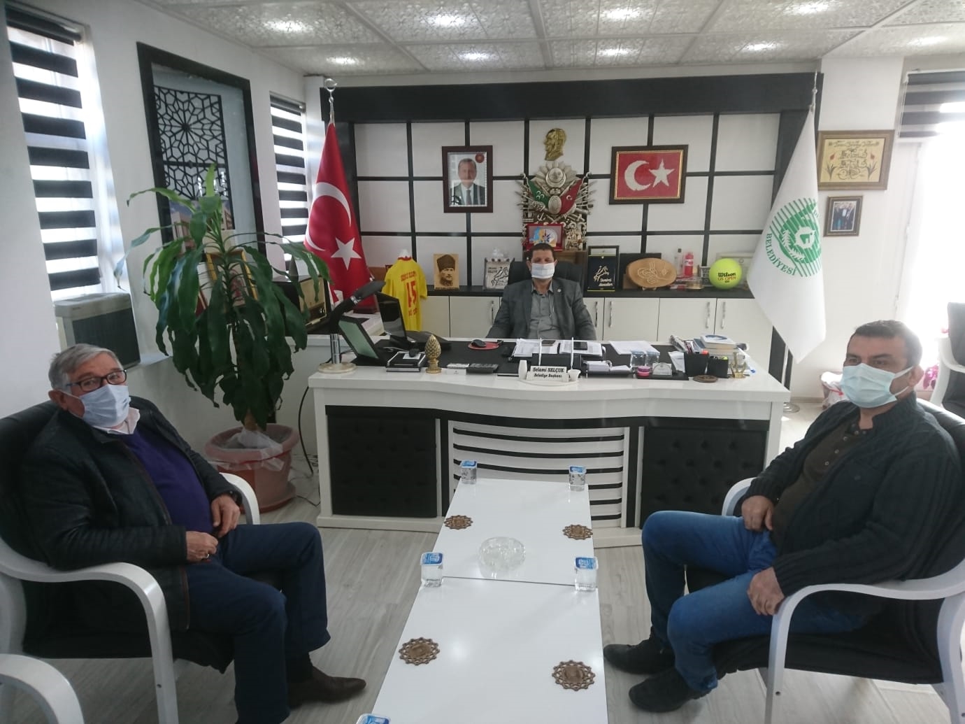 Adalet Bakanlığı İnşaat Kontrol Mühendisi Yusuf Kaya ve İlçemize Cezaevi İnşaatını yapan yüklenici Firma Yönetim Kurulu Başkanı Zekeriya Sezen, Belediye Başkanı Selami Selçuk'u makamında ziyaret etti.