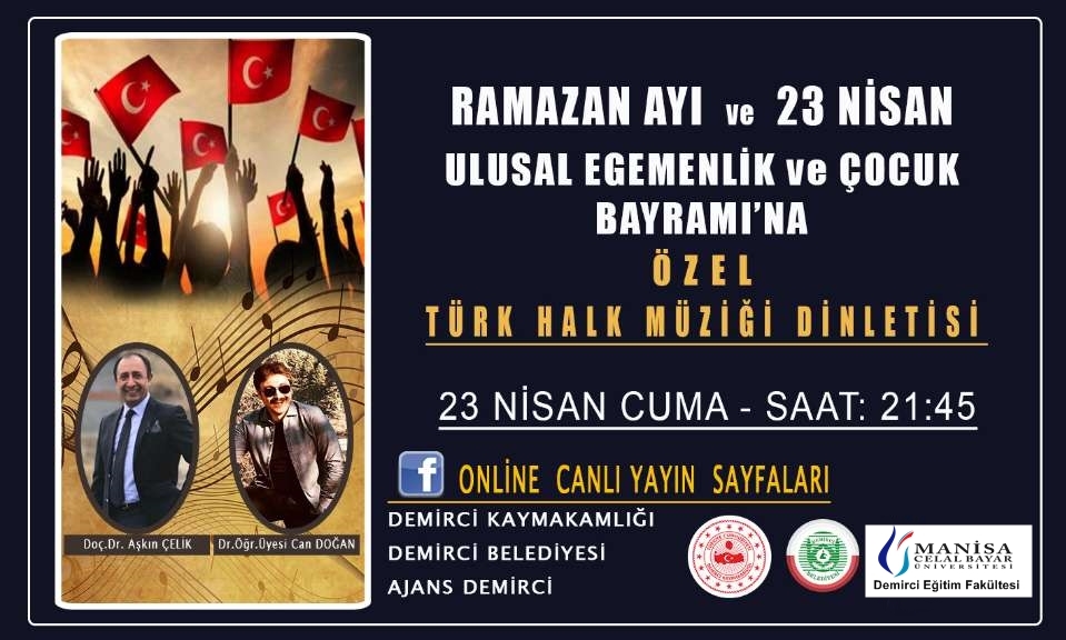 Demirci Kaymakamlığı, Demirci Belediyesi ve Celal Bayar Üniversitesi Demirci Eğitim Fakültesi işbirliği ile 23 Nisan Cuma akşamı Türk Halk Müziği dinleti programı yapılacak.