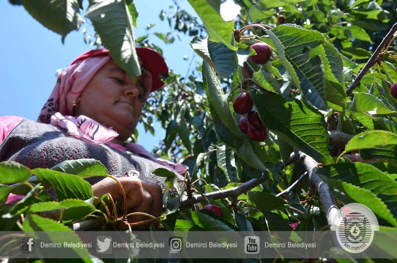 Ege en son kiraz hasadının yapıldığı Demirci'de İrişler, Kargınışıklar, Minnetler ve Çamköy mahallelerinde üreticiler 1400 rakımlı ormanlarda arazilerinde yetiştirdikleri 0900 Demirci Kirazı'nı toplamaya devam ediyorlar.