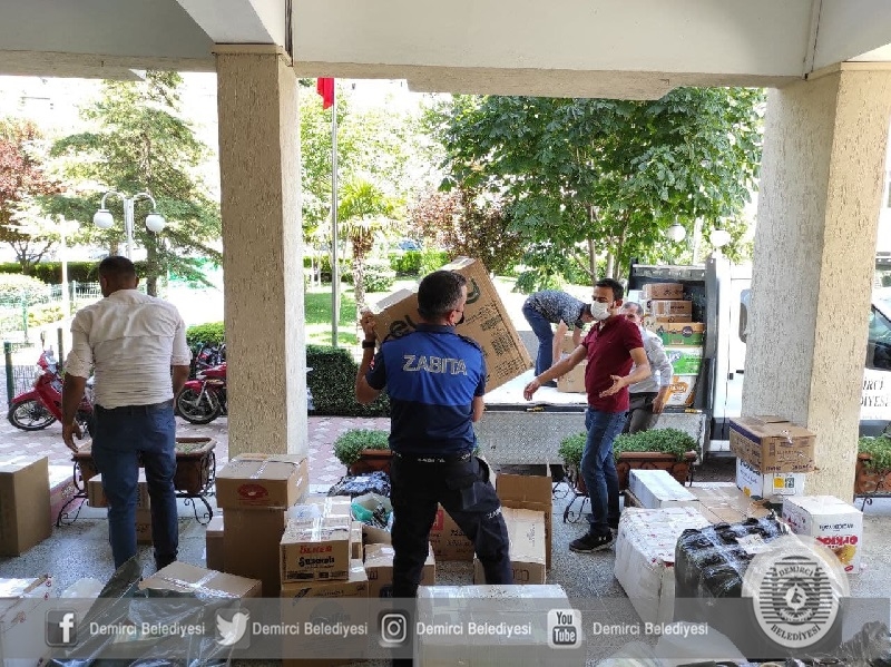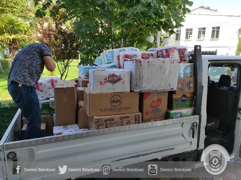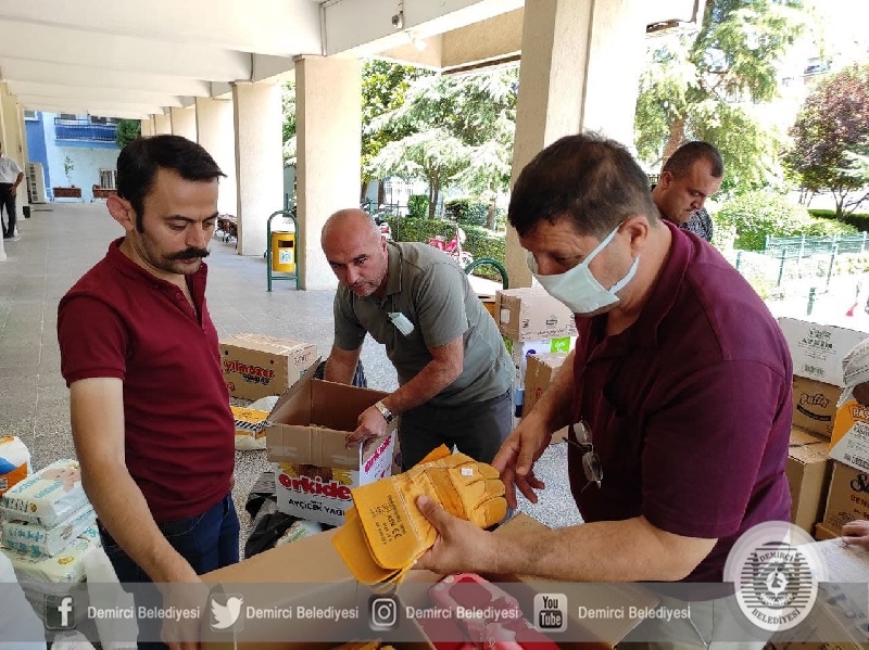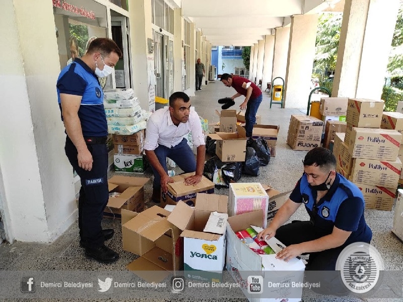Demirci Belediyesi ve Cumhur İttifakı tarafından düzenlenen kampanyada ıslak mendil, bebek bezi, yanmaz eldiven, iş ayakkabısı, maske, lamba, kafa lambası ve çamaşır eşyalardan oluşan yardım malzemeleri toplandı.
