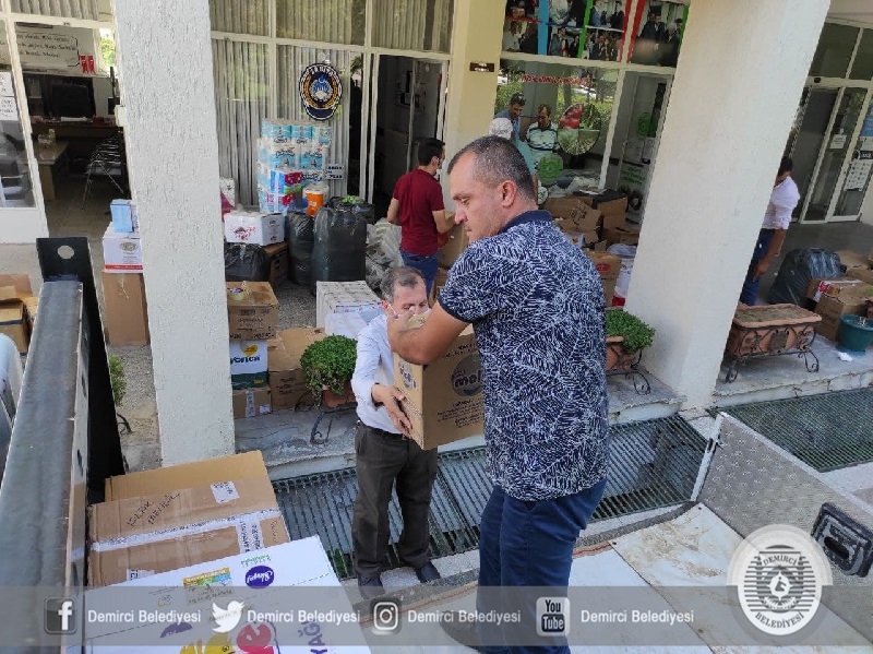 Demirci'de Muğla'da meydana gelen orman yangınları sebebiyle vatandaşlar ve orman personeli için toplanan yardım malzemelerini bölgeye gönderdi.