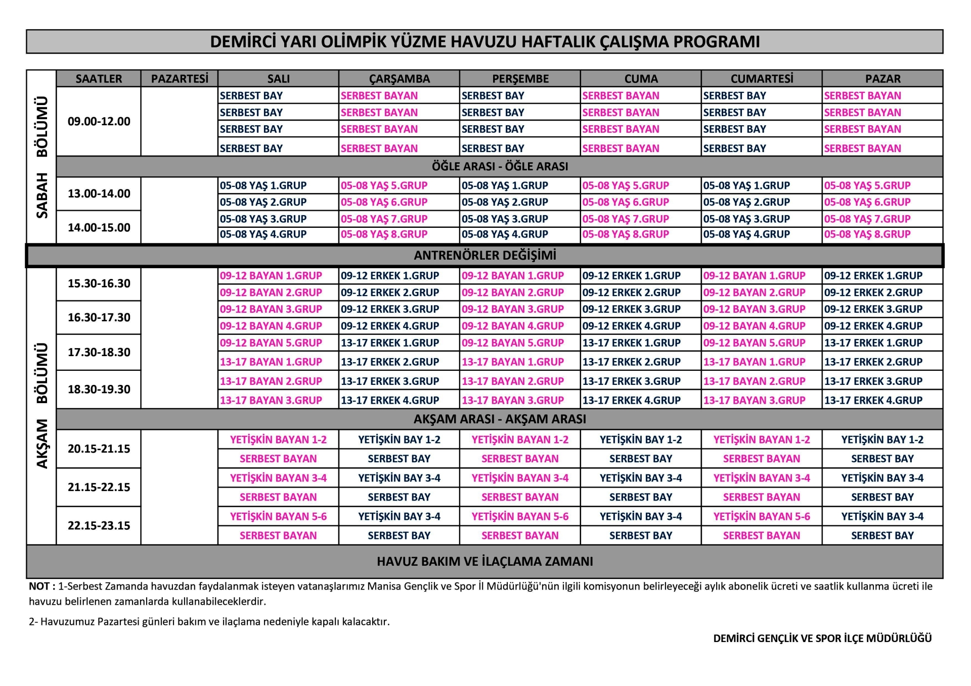 YARI OLİMPİK YÜZME HAVUZU HAFTALIK PROGRAMI İSE ŞU ŞEKİLDEDİR.