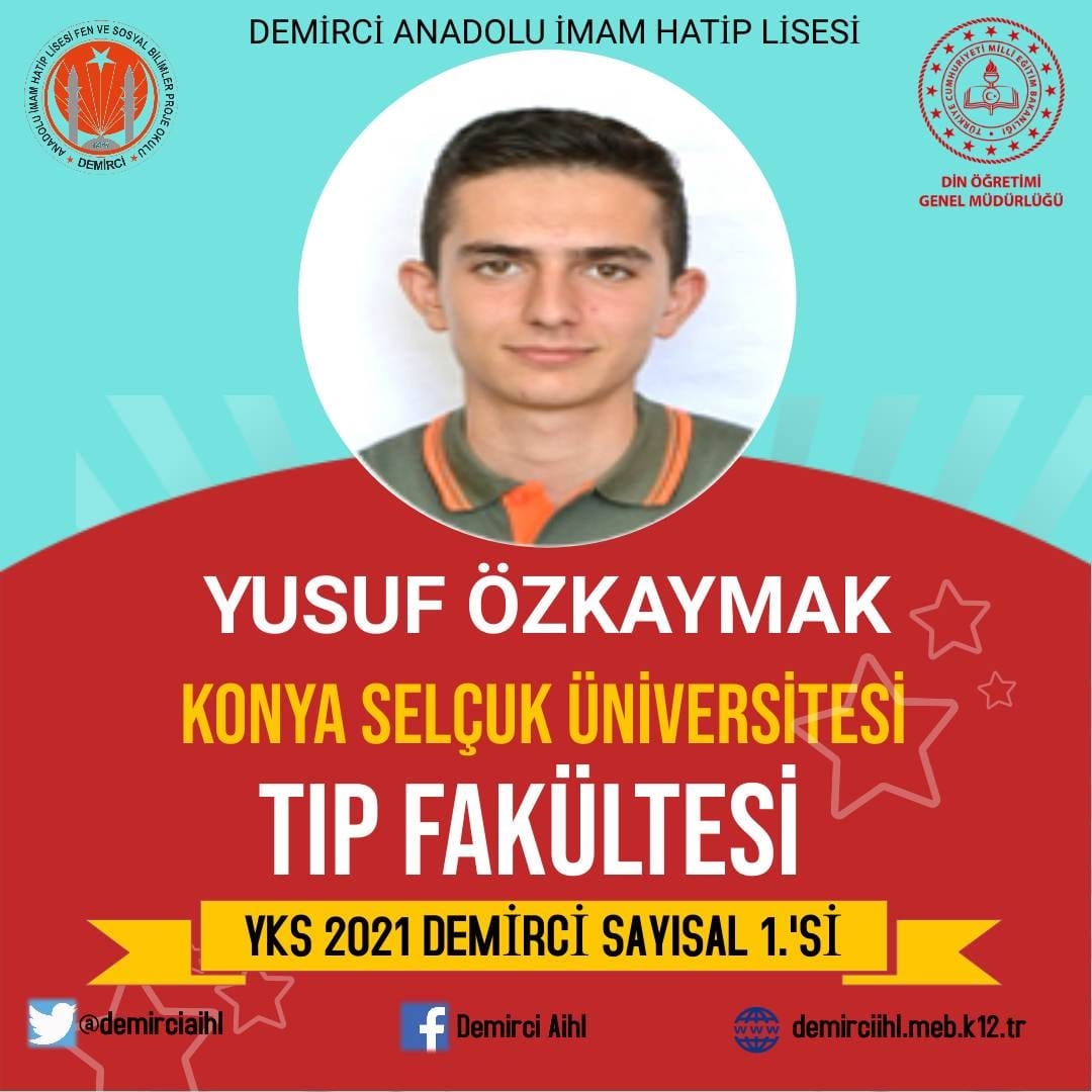 2021 YKS tercih sonuçlarına göre Demirci İmam Hatip Lisesi Öğrencisi Yusuf Özkaymak Tıp Fakültesine yerleşerek ilçemize büyük bir sevinç yaşattı.