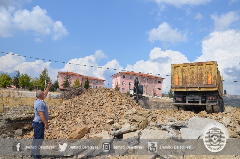 Demirci Belediyesi de inşaat çalışmalarına destek verirken, iş makineleri de alanda tesviye ve düzenlemesi hızla sürdürülüyor.