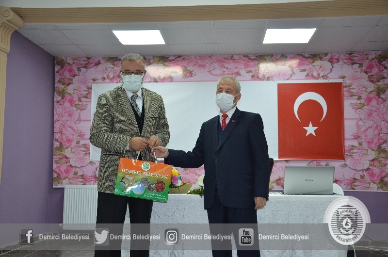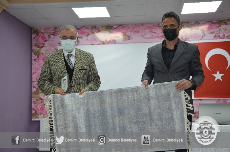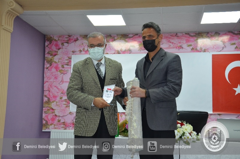 Yaklaşık 1 saat süren konferansın sonunda Belediye Başkan Yardımcısı Mustafa Ünlü ve Kaymakam Adem Kaya tarafından plaket, el dokuma seccade ve çiçek hediye edildi.