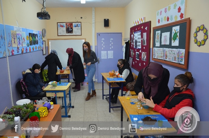 Halk Eğitimi Merkezi Müdürlüğü usta öğreticileri tarafından Kaymakam İbrahim Ethem Akıncı Mesleki ve Teknik Anadolu Lisesi ve Mesleki ve Teknik Anadolu Lisesinde haftada 3 gün özel eğitim sınıfındaki öğrencilere ahşap boyama, ebru, resim Saksı yapımı ve Terrarium yapımı gibi el sanatları öğretiliyor.