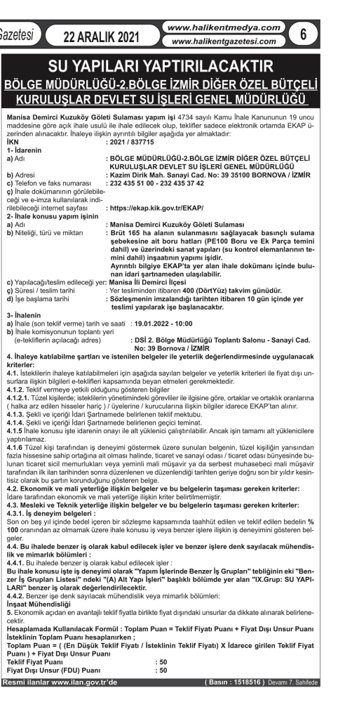 Diğer yandan Kuzuköy Sulama Barajının su yapı ihalesi de 19 Ocak 2022 Çarşamba günü saat: 10.00'da İzmir 2. Bölge Müdürlüğünde yapılacak.