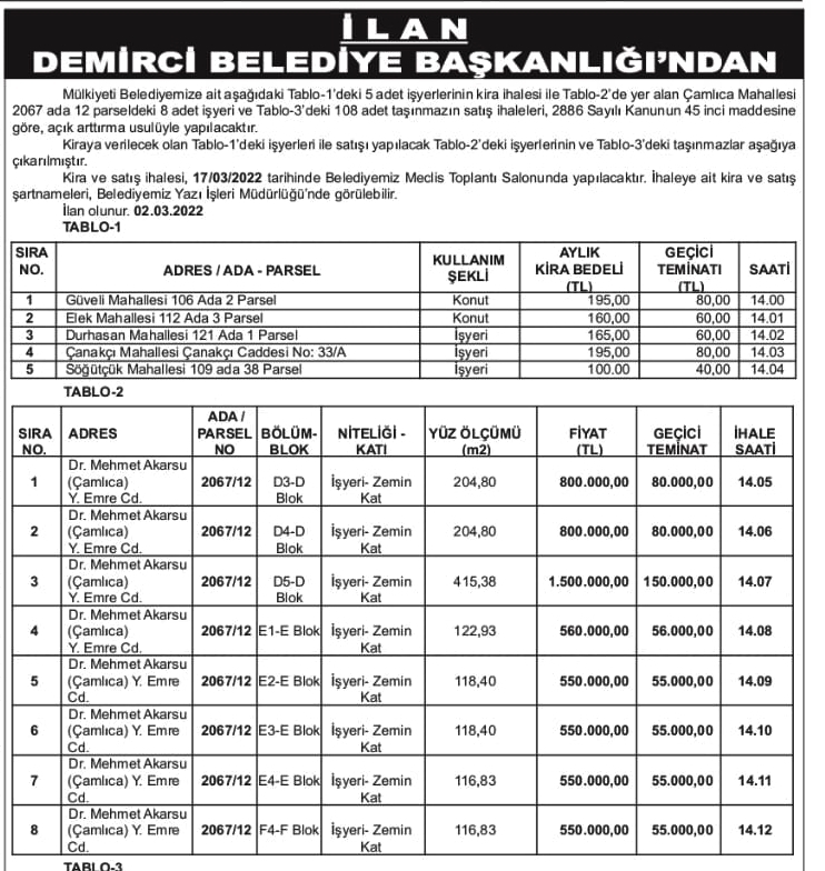 Galericiler sitesinde yer alan alt kısımdaki 8 iş yeri için Belediyemiz tarafından 17 Mart Perşembe günü saat: 14.00'da Belediyemiz Meclis Salonunda açık arttırma usulüne göre ihale yapılacak.