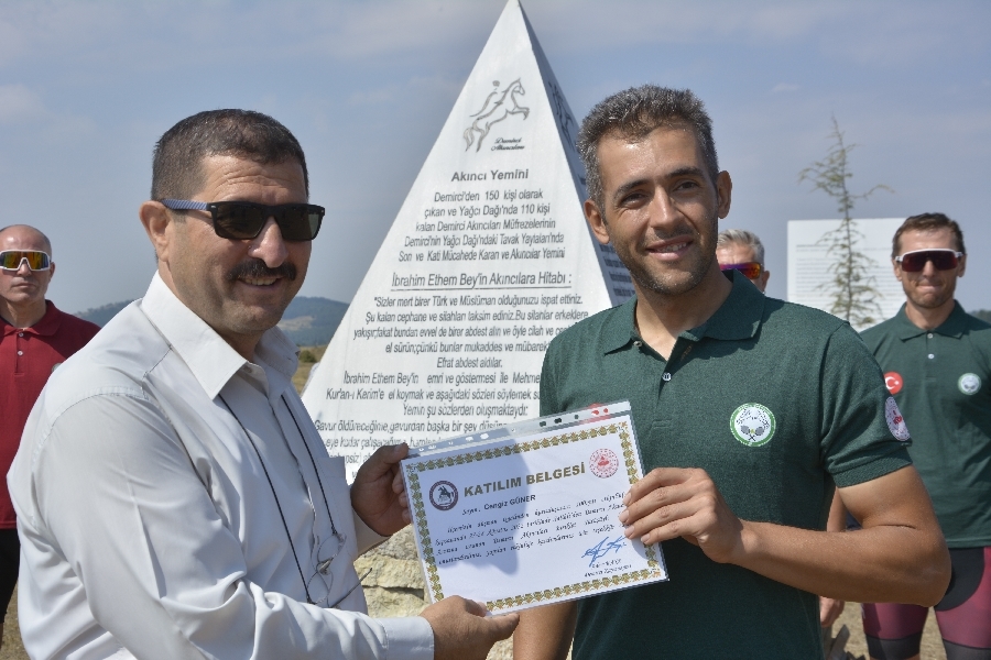 Demirci Kaymakamı Adem Kaya, Belediye Başkanı Selami Selçuk ve Milli Tenisçi Salih Kasapoğlu tarafından 100. Yılda Demirci Akıncıları 3. bisiklet sürüşüne katılan sporculara teşekkür belgesi takdim edildi.