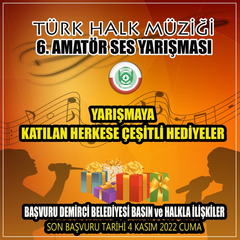 Türk Halk Müziği 6. Amatör Ses yarışmasına katılmak isteyenlerin 4 Kasım 2022 Cuma günü mesai bitimine kadar Demirci Belediyesi Basın ve Halkla İlişkiler birimine şahsen başvuru yapabilirler.