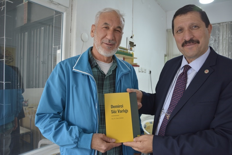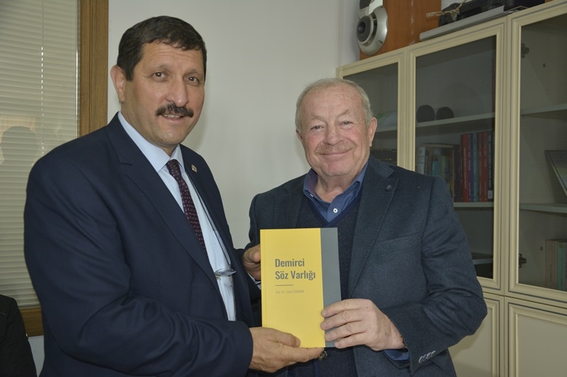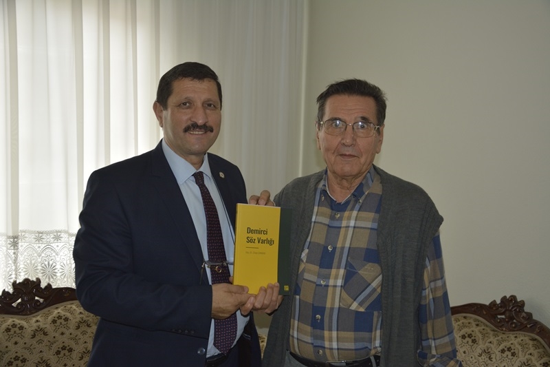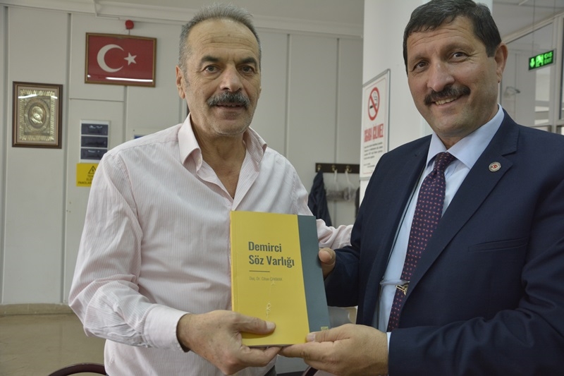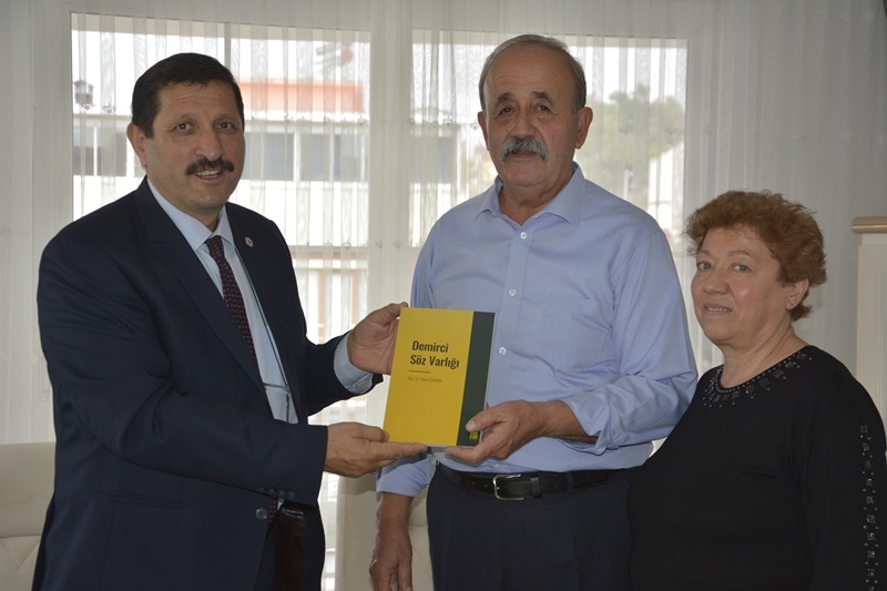 Başkan Selçuk emekli öğretmenlerle sohbet ederken,belediyenin kültür hizmeti olan " Demirci Söz Varlığı " kitabından hediye etti.