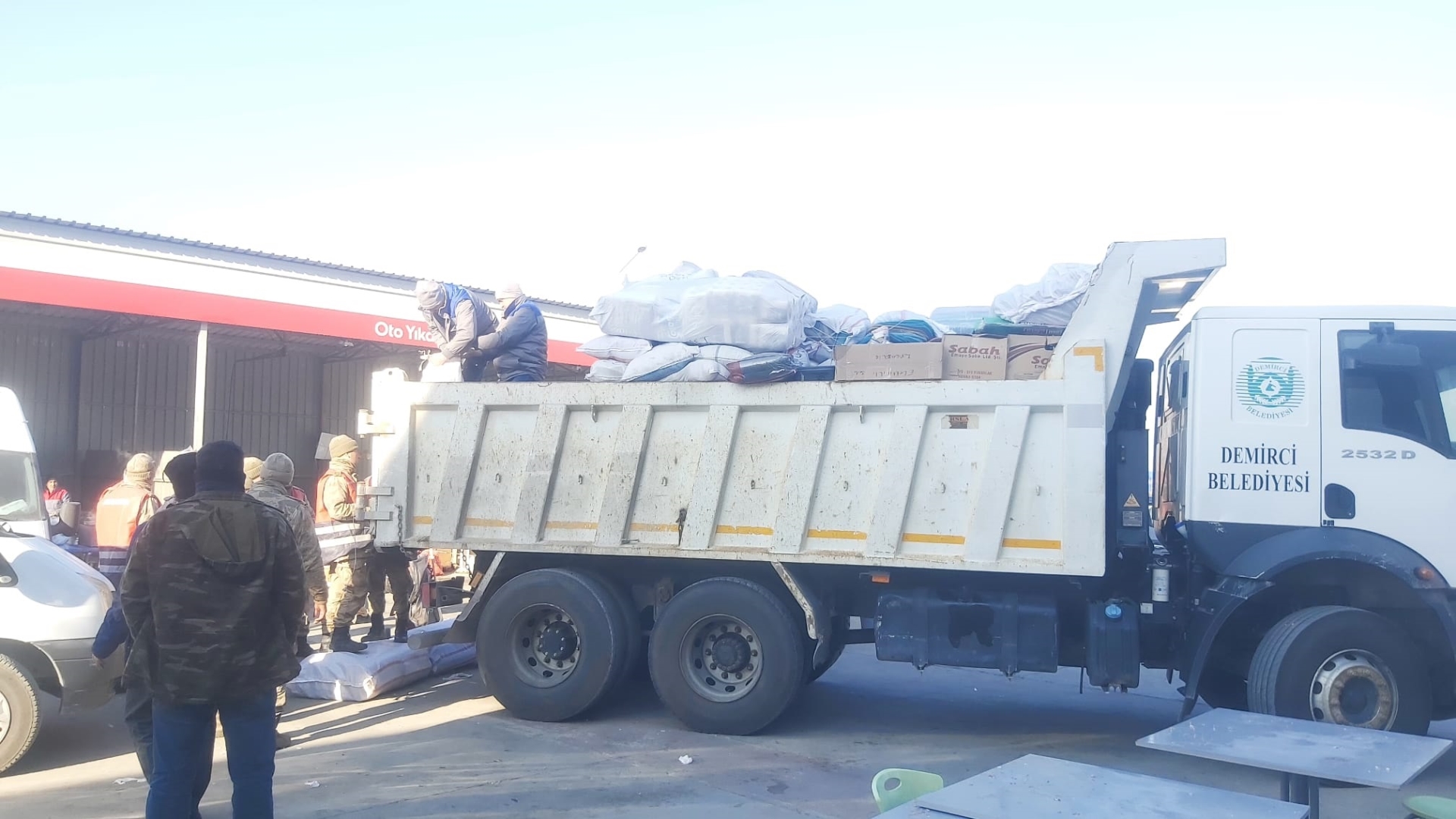 Demirci'de de Kaymakamlık ve Belediye işbirliği ile depremin ilk gününden bu yana deprem bölgesine 7 kamyon ve 3 tır yardım malzemesi gönderildi.