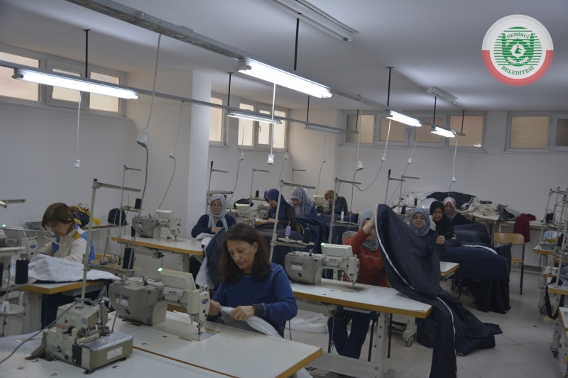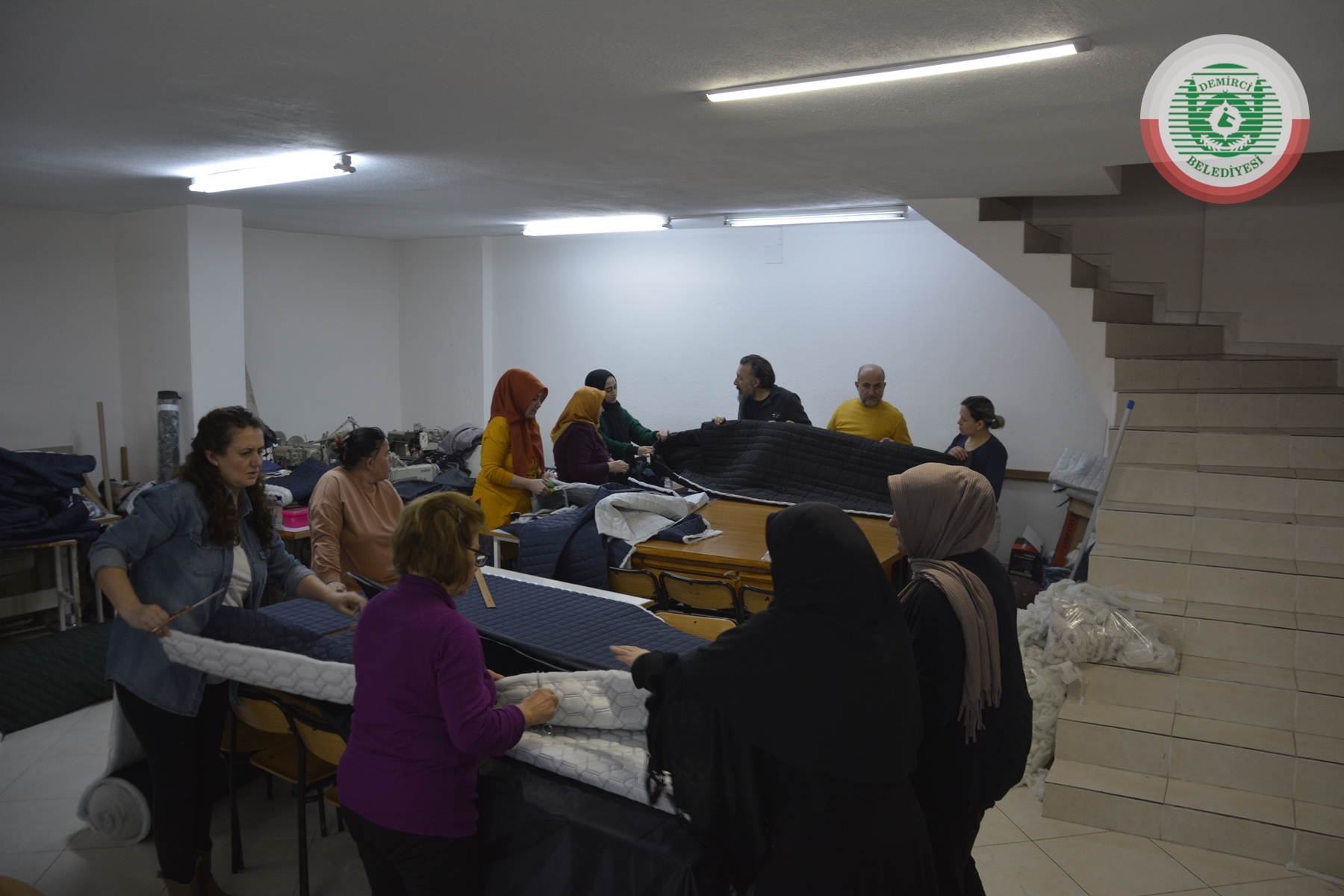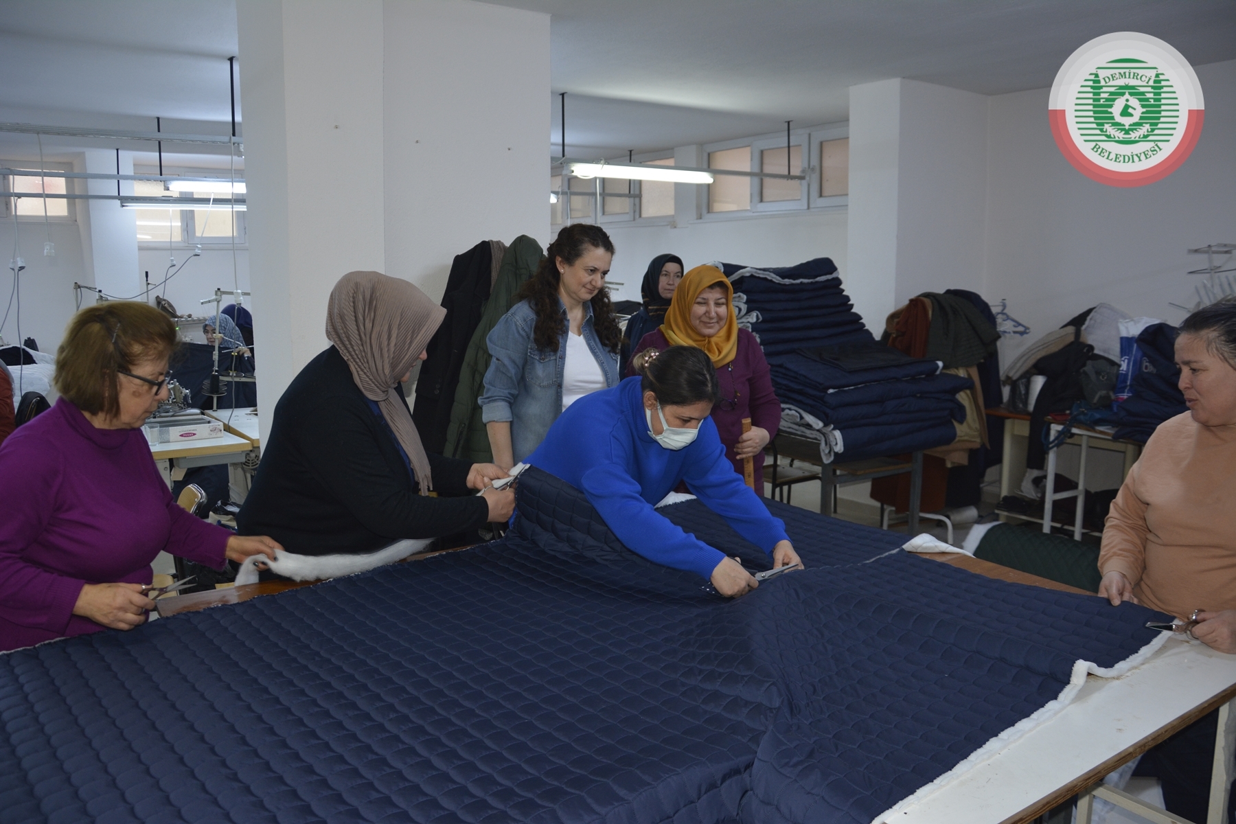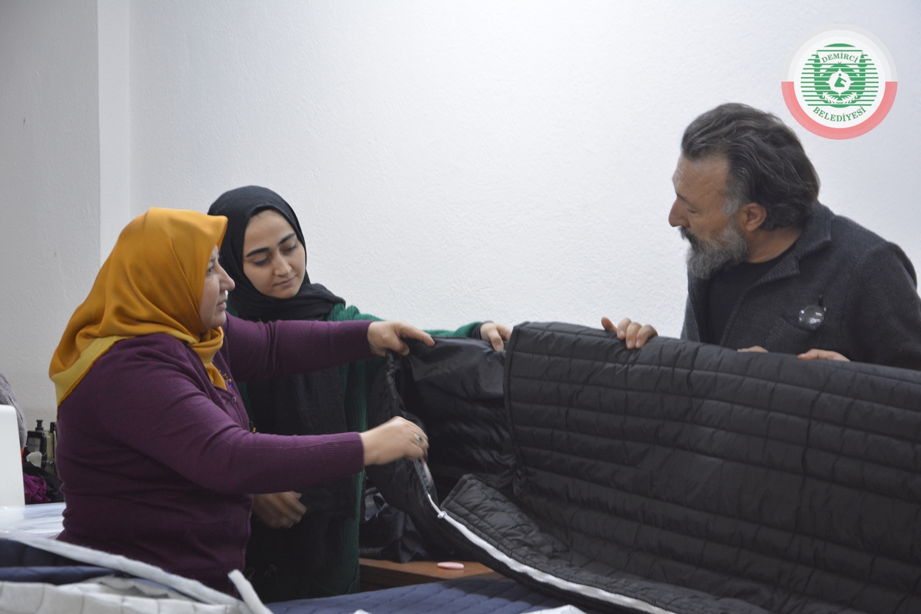 Demirci Kaymakamlığı koordinesinde Demirci Halk Eğitimi Merkezi Müdürlüğü bünyesinde usta öğreticiler ve gönüllü kadınlar kurumun dikiş atölyesinde gece gündüz demeden deprem bölgesindeki vatandaşlar ve görevliler için uyku tulumu hazırlıyor.