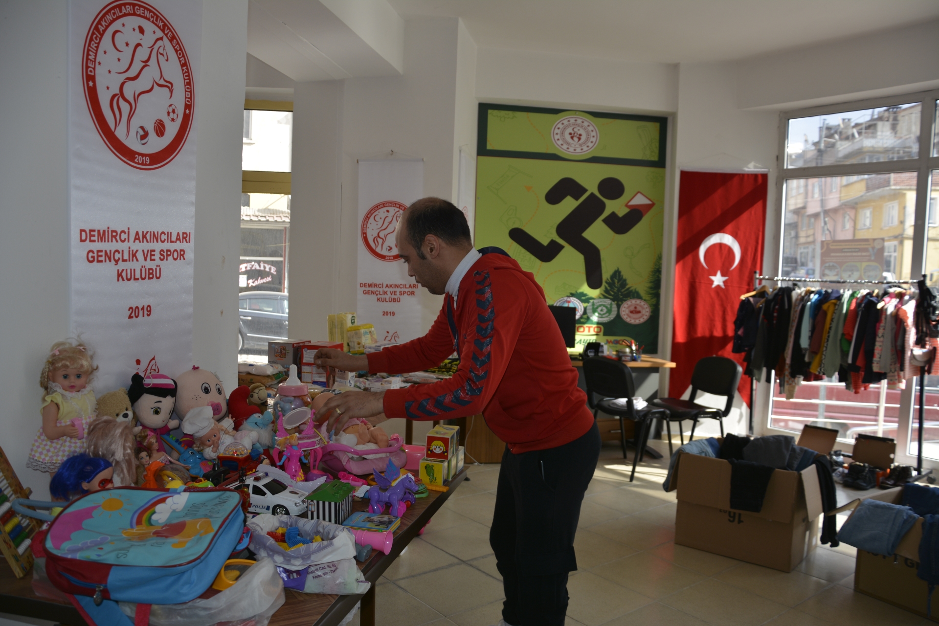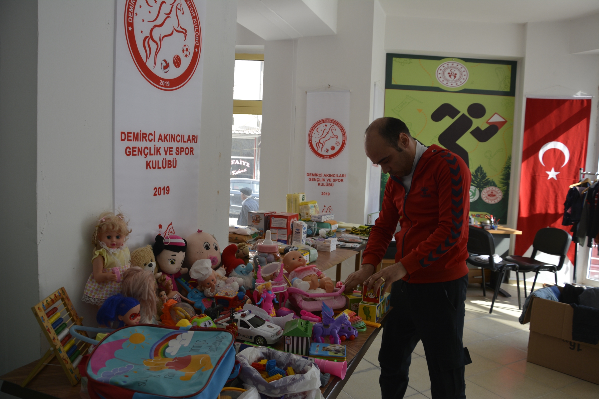Merkez üssü Kahramanmaraş'ın Pazarcık ilçesi olan ve 10 ili etkileyen depremin ardından Demirci'ye misafir olarak gelen depremzedeler için Gençlik ve Spor İlçe Müdürlüğü bünyesinde kurulan sosyal markette giyimden, oyuncağa, gıda ve temizlik eşyalarına kadar birçok ürün yer alıyor.