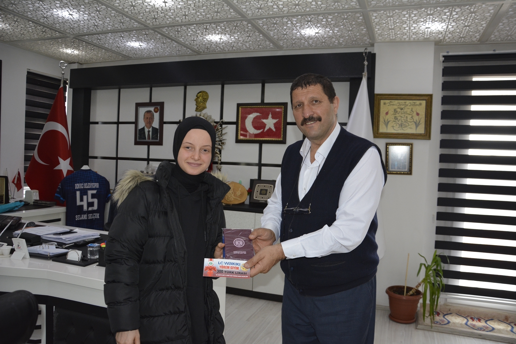 Manisa'da yapılan Kur'an-ı Kerim ve ezan okuma yarışmasında birinci olan Demircili öğrenciler Belediye Başkanı Selami Selçuk tarafından ödüllendirildi.