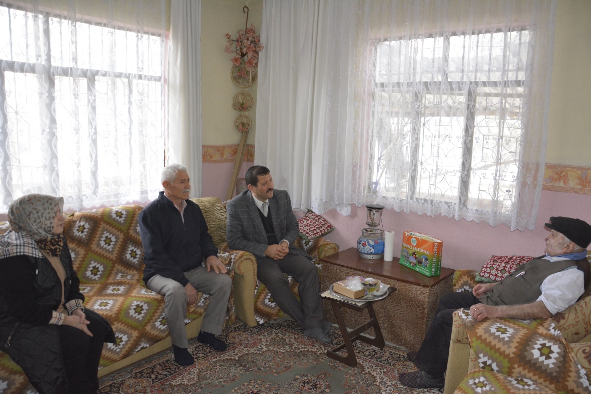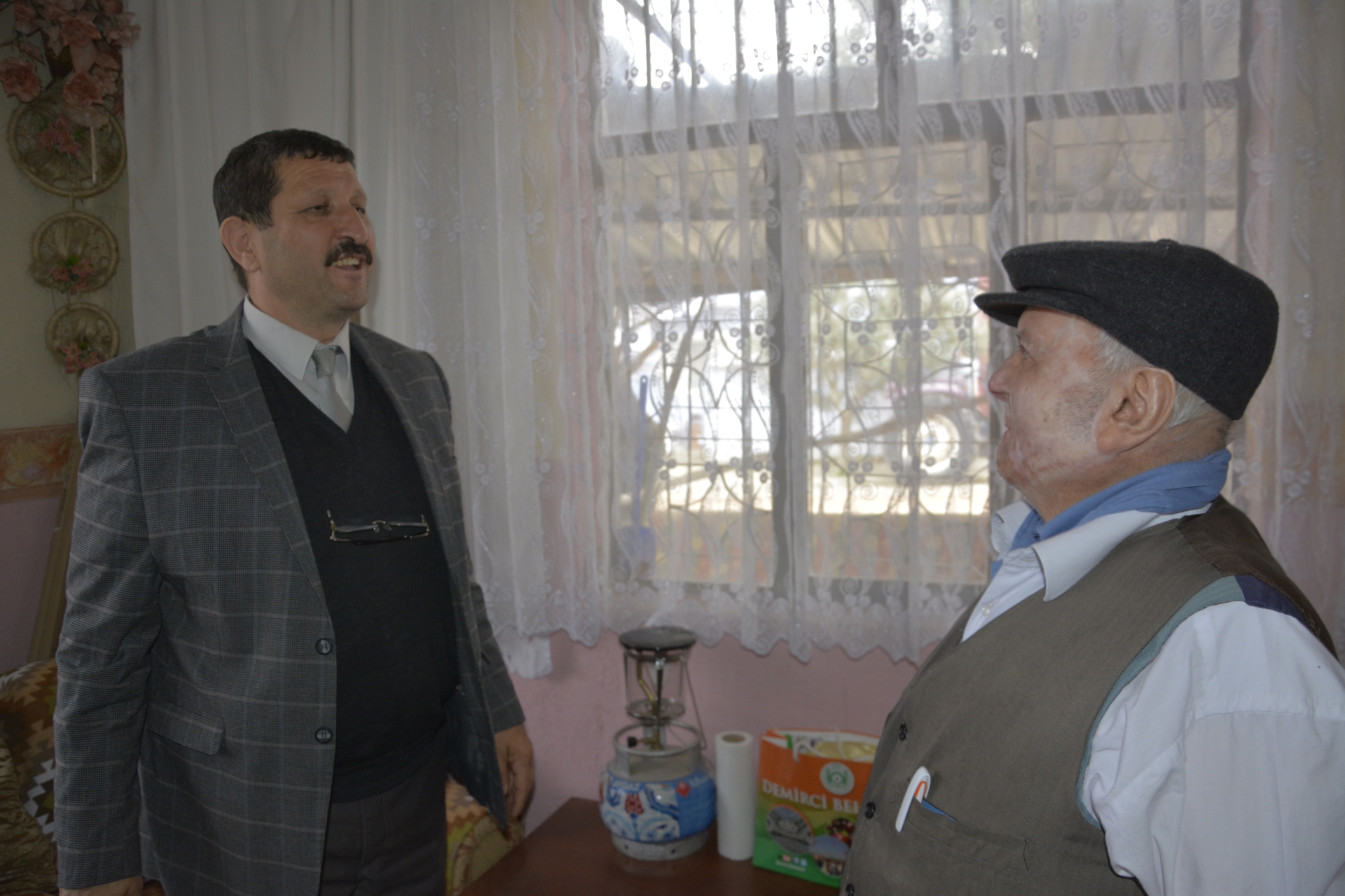 Demirci Belediye Başkanı Selami Selçuk, AK Parti İlçe Yönetim Kurulu Üyeleri Ayşe Çakır Karagül ve Mevlüt Önder ile birlikte Doktor Mehmet Akarsu Mahallesinde İkamet eden 92 yaşındaki Yaşar Uyar'ı evinde ziyaret ettiler.