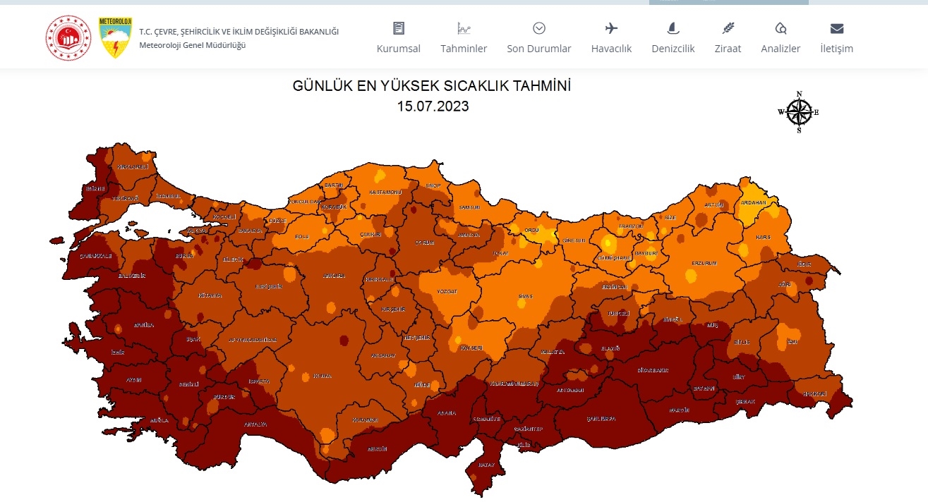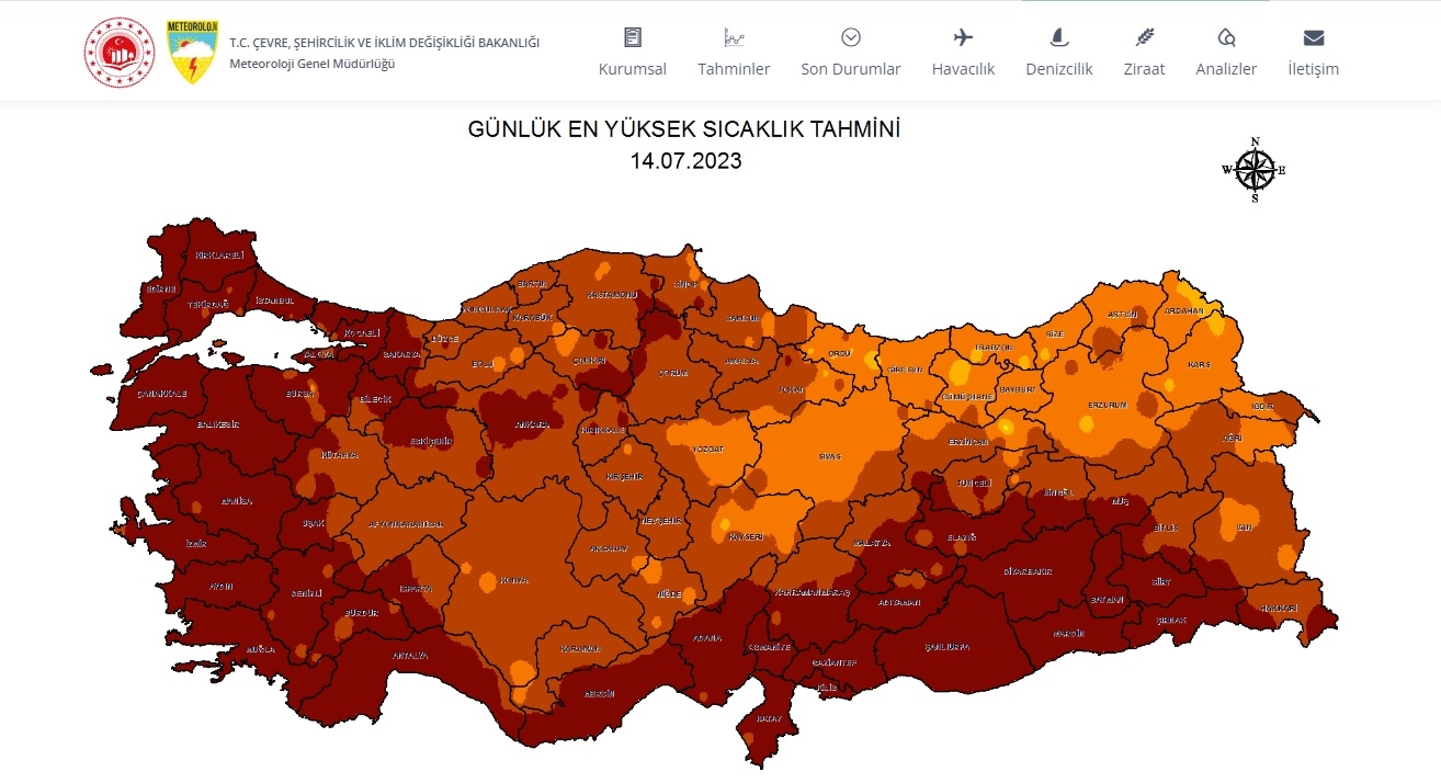 Meteroloji ; Yapılan son değerlendirmelere göre; 11.07.2023 Salı günü batı kesimlerden başlayarak ülkemizin sıcak hava dalgasının etkisine gireceği tahmin ediliyor. Hafta ortasından itibaren sıcaklıkların Marmara, Ege ve Akdeniz’de mevsim normallerinin 5-10 derece, diğer bölgelerimizde 2-6 derece üzerine çıkması bekleniyor.
