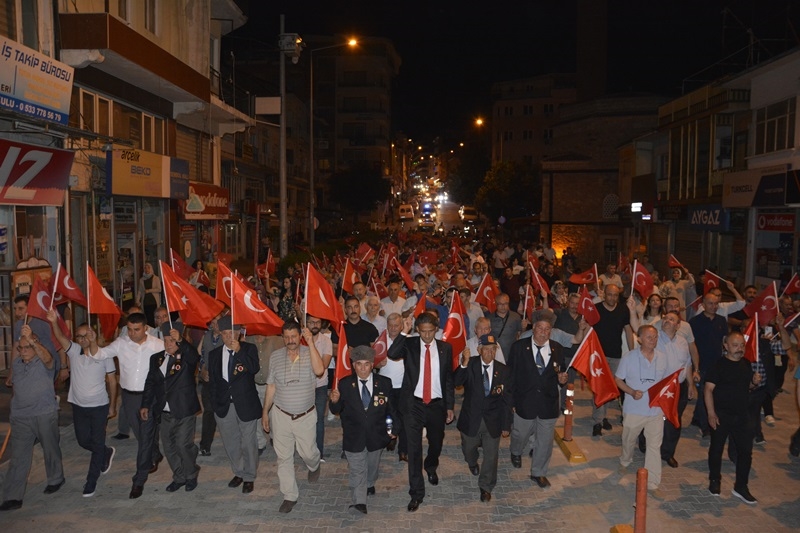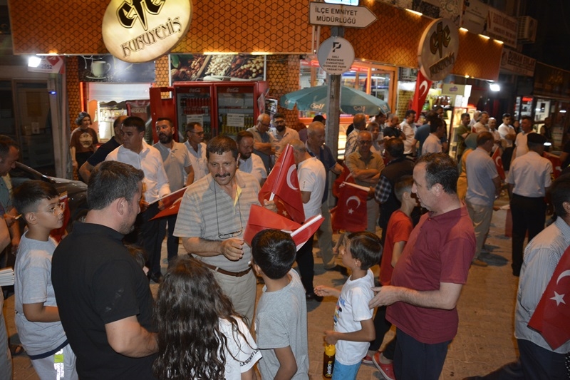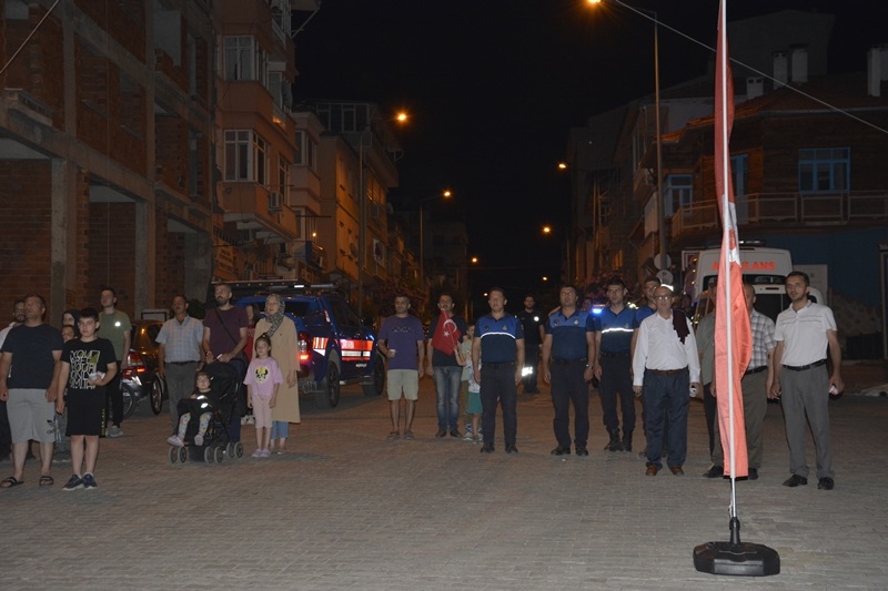 Sala’nın ardından İlçe Müftü Vekili Süleyman Bilgili tarafından Şehitler için okunmasının ardından saat : 00.13’de meydanda ve ilçe genelinde Sala okundu.