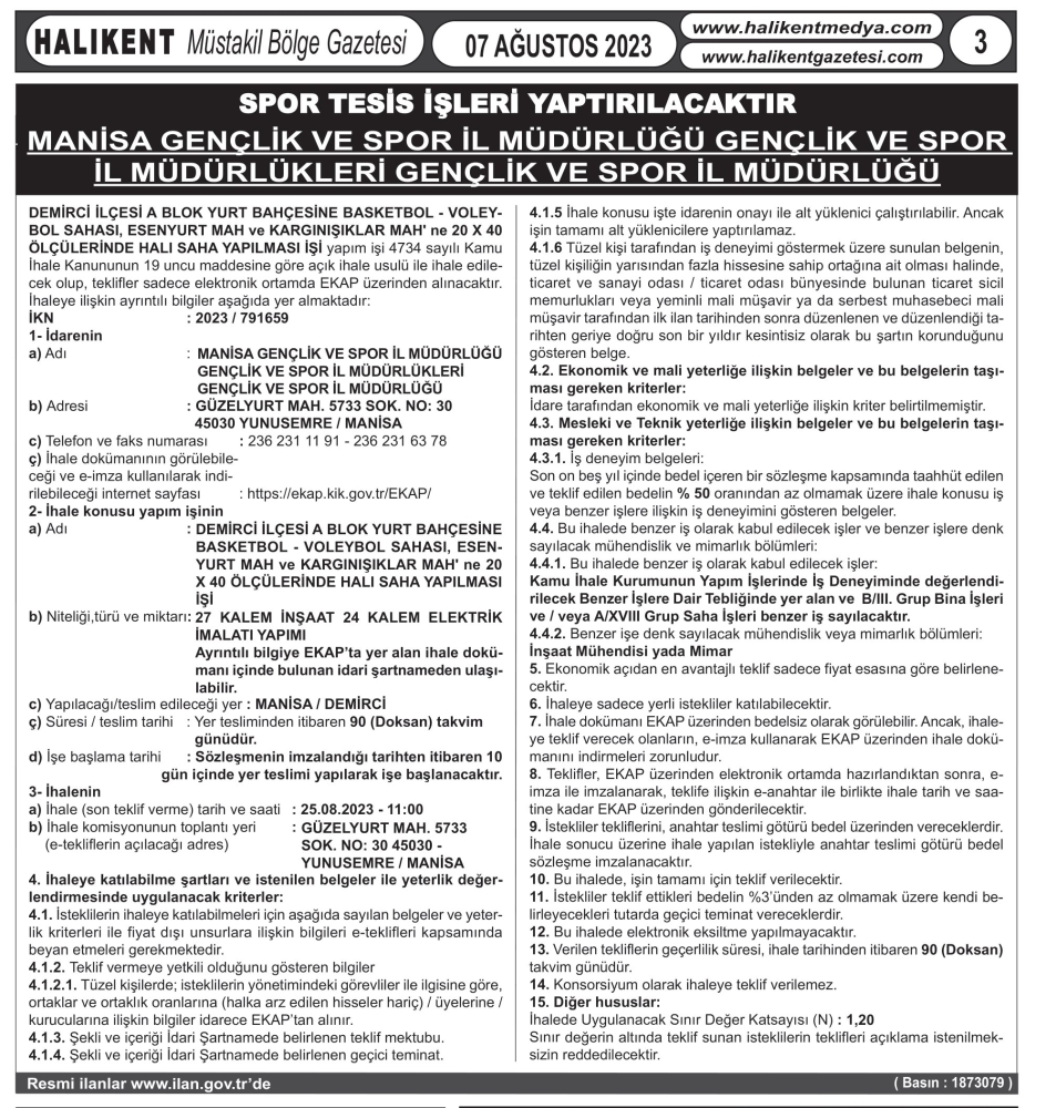 Spor kenti olma yolunda hızla ilerleyen Demirci'de 25 Ağustos 2023 tarihinde 2 halı saha ve yeni spor sahalarının ihaleleri yapılacak.